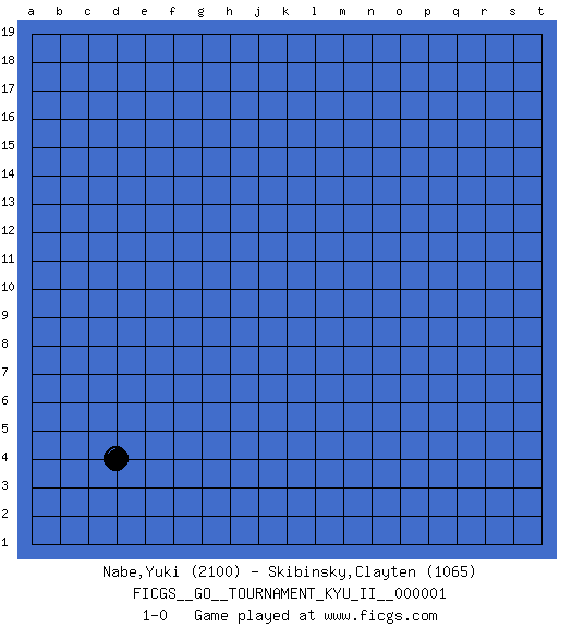 Last move : 1-0 2007 December 22 21:37:35 [Event "FICGS__GO__TOURNAMENT_KYU_II__000001"] [Site "FICGS"] [Date "2007.11.22"] [Round "1"] [Black "Nabe,Yuki"] [White "Skibinsky,Clayten"] [Result "1-0"] [Rating 1 "2100"] [Rating 2 "1065"] 1.d4 1-0 This go game has been lost on time (started : 2007.11.22 14:29:50) Here are the names of the openings (joseki) played in the four corners : Corner d4 : d4 1-0 Hoshi (Hwajeom, Seongjeom, Xingwei`) 4-4 Point. The star or hoshi (4-4) point, emphasizing influence at the potential expense of territory. Player Black won this Go (weiqi, baduk) game. Follow this game move after move (download)Never try to cut bamboo joints. (Anonymous) Wisdom is the reward you get for a lifetime of listening when you'd have preferred to talk. (Doug Larson)