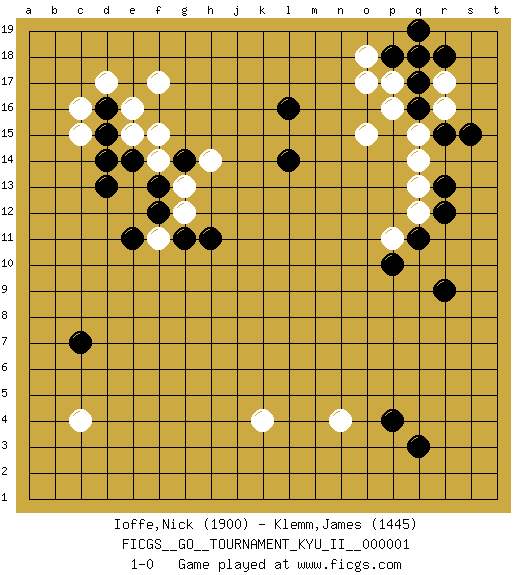 Last move : 1-0 2008 March 10 15:54:18 [Event "FICGS__GO__TOURNAMENT_KYU_II__000001"] [Site "FICGS"] [Date "2007.11.22"] [Round "1"] [Black "Ioffe,Nick"] [White "Klemm,James"] [Result "1-0"] [Rating 1 "1900"] [Rating 2 "1445"] 1.q16 d17 2.q3 c4 3.r9 n4 4.p4 k4 5.d15 e15 6.e14 e16 7.d13 f14 8.f13 g13 9.g14 f15 10.f12 h14 11.h11 c15 12.d16 c16 13.d14 f17 14.c7 o17 15.l16 o15 16.l14 q14 17.s15 q18 18.p18 p17 19.r18 r17 20.q17 r16 21.r15 q15 22.q19 p16 23.q18 o18 24.r13 q13 25.r12 q12 26.q11 p11 27.p10 g12 28.g11 f11 29.e11 1-0 This go game has been lost on time (started : 2007.11.22 14:29:50) Here are the names of the openings (joseki) played in the four corners : Corner d16 : d17 d15 Komoku (Somok, Xiao~mu`) 3-4 Point. The komoku (3-4) point is the traditional corner enclosure move.. Ikken Takagakari (Hankan Nop'dakeolch'im, Yi Gaogua`jiao~, 1-Space High Approach). The 5-4 approach move has become more popular in modern times, as modern Go emphasizes speed and influence. Corner d4 : c4 c7 Komoku (Somok, Xiao~mu`) 3-4 Point. The komoku (3-4) point is the traditional corner enclosure move.. Corner q16 : q16 o17 Hoshi (Hwajeom, Seongjeom, Xingwei`) 4-4 Point. The star or hoshi (4-4) point, emphasizing influence at the potential expense of territory. Ikken Kakari (Hankan Keolch'im, Yi Gua`jiao~, 1-Space Low Approach). White 2 is the standard approach move to the 4-4. Player Black won this Go (weiqi, baduk) game. Follow this game move after move (download)Territory is a closed space where time no longer exists. The transformation around it slower alter it, and sometimes it cracks open like a rotten egg at the least shock. (Pierre Audouard) Before all elsed, be armed. (Niccolo Machiavelli)