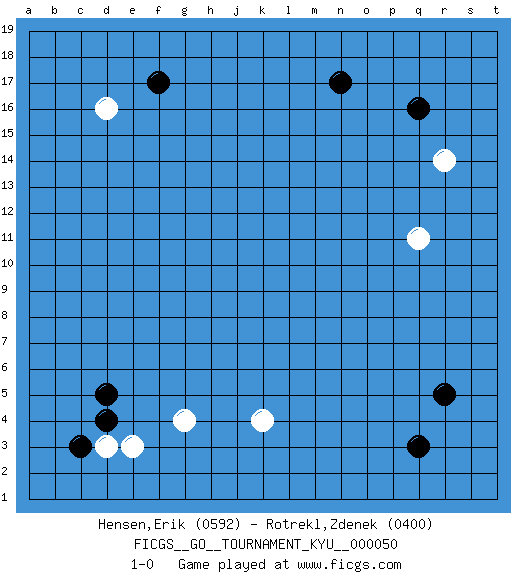 Last move : 1-0 2008 January 7 10:50:45 [Event "FICGS__GO__TOURNAMENT_KYU__000050 "] [Site "FICGS"] [Date "2007.11.23"] [Round "1"] [Black "Hensen,Erik "] [White "Rotrekl,Zdenek "] [Result "1-0"] [Rating 1 "0592"] [Rating 2 "0400"] 1.q16 d16 2.q3 d3 3.r5 r14 4.n17 q11 5.d5 g4 6.c3 k4 7.d4 e3 8.f17 1-0 This go game has been lost on time (started : 2007.11.23 9:49:2) Here are the names of the openings (joseki) played in the four corners : Corner q16 : q16 r14Hoshi (Hwajeom, Seongjeom, Xingwei`) 4-4 Point. The star or hoshi (4-4) point, emphasizing influence at the potential expense of territory.Ikken Kakari (Hankan Keolch'im, Yi Gua`jiao~, 1-Space Low Approach). White 2 is the standard approach move to the 4-4. Corner d4 : d3 d5Komoku (Somok, Xiao~mu`) 3-4 Point. The komoku (3-4) point is the traditional corner enclosure move..Ikken Takagakari (Hankan Nop'dakeolch'im, Yi Gaogua`jiao~, 1-Space High Approach). The 5-4 approach move has become more popular in modern times, as modern Go emphasizes speed and influence. Corner d16 : d16 f17Hoshi (Hwajeom, Seongjeom, Xingwei`) 4-4 Point. The star or hoshi (4-4) point, emphasizing influence at the potential expense of territory.Ikken Kakari (Hankan Keolch'im, Yi Gua`jiao~, 1-Space Low Approach). Black 2 is the standard approach move to the 4-4. Player Black won this Go (weiqi, baduk) game.Follow this game move after move (download ) In the opening, when you don't know what to play, make a shimari. (Jansteen) The right perception of any matter and a misunderstanding of the same matter do not wholly exclude each other. (Kafka's the trial)