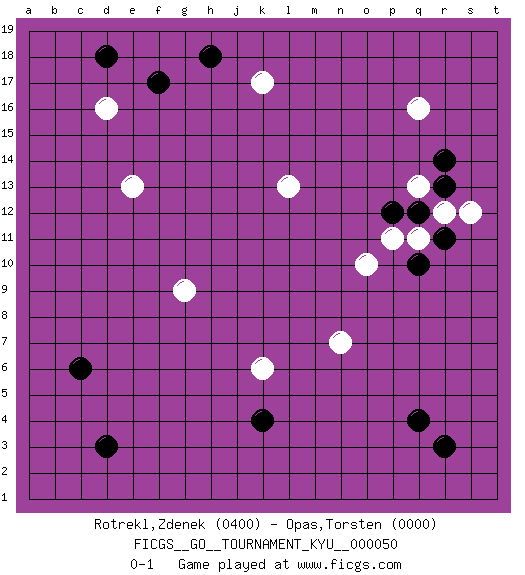 Last move : 0-1 2008 January 12 11:6:37 [Event "FICGS__GO__TOURNAMENT_KYU__000050 "] [Site "FICGS"] [Date "2007.11.23"] [Round "1"] [Black "Rotrekl,Zdenek "] [White "Opas,Torsten "] [Result "0-1"] [Rating 1 "0400"] [Rating 2 "0000"] 1.q4 d16 2.d3 q16 3.r14 o10 4.q10 g9 5.k4 l13 6.c6 n7 7.r3 k6 8.f17 k17 9.d18 e13 10.h18 r12 11.q12 q13 12.r13 q11 13.p12 p11 14.r11 s12 0-1 This go game has been lost on time (started : 2007.11.23 9:49:2) Here are the names of the openings (joseki) played in the four corners : Corner q16 : q16 r14Hoshi (Hwajeom, Seongjeom, Xingwei`) 4-4 Point. The star or hoshi (4-4) point, emphasizing influence at the potential expense of territory.Ikken Kakari (Hankan Keolch'im, Yi Gua`jiao~, 1-Space Low Approach). Black 2 is the standard approach move to the 4-4. Corner d4 : d3 g9Komoku (Somok, Xiao~mu`) 3-4 Point. The komoku (3-4) point is the traditional corner enclosure move.. Corner q4 : q4 n7Hoshi (Hwajeom, Seongjeom, Xingwei`) 4-4 Point. The star or hoshi (4-4) point, emphasizing influence at the potential expense of territory. Corner d16 : d16 f17Hoshi (Hwajeom, Seongjeom, Xingwei`) 4-4 Point. The star or hoshi (4-4) point, emphasizing influence at the potential expense of territory.Ikken Kakari (Hankan Keolch'im, Yi Gua`jiao~, 1-Space Low Approach). Black 2 is the standard approach move to the 4-4. Player White won this Go (weiqi, baduk) game.Follow this game move after move (download ) The saki bottle shape is negative. (Anonymous) They misunderestimated me. (George W. Bush, Bentonville nov. 6, 2000)