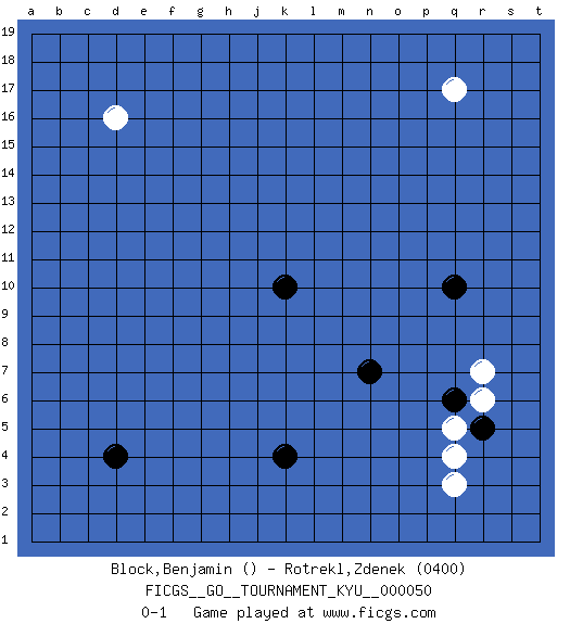 Last move : 0-1 2007 November 30 16:0:45 [Event "FICGS__GO__TOURNAMENT_KYU__000050"] [Site "FICGS"] [Date "2007.11.23"] [Round "1"] [Black "Block,Benjamin"] [White "Rotrekl,Zdenek"] [Result "0-1"] [Rating 2 "0400"] 1.d4 d16 2.k4 q17 3.k10 q4 4.q10 r7 5.r5 q5 6.n7 r6 7.q6 q3 0-1 Here are the names of the openings (joseki) played in the four corners : Player White won this Go (weiqi, baduk) game. Follow this game move after move (download)Don't make empty triangles. (Anonymous) Indecision is the key to flexibility. (Unknown)