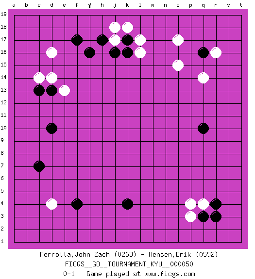 Last move : 0-1 2008 February 15 13:31:23 [Event "FICGS__GO__TOURNAMENT_KYU__000050 "] [Site "FICGS"] [Date "2007.11.23"] [Round "1"] [Black "Perrotta,John Zach "] [White "Hensen,Erik "] [Result "0-1"] [Rating 1 "0263"] [Rating 2 "0592"] 1.r4 d16 2.q16 d4 3.f17 p3 4.q3 p4 5.k4 o17 6.d10 d14 7.j16 l17 8.k17 l16 9.q10 o15 10.c7 q4 11.r3 q14 12.c13 r16 13.f4 j17 14.h17 j18 15.k16 c14 16.d13 k18 17.g16 e13 0-1 This go game has been lost on time (started : 2007.11.23 9:49:2) Here are the names of the openings (joseki) played in the four corners : Corner d16 : d16 f17Hoshi (Hwajeom, Seongjeom, Xingwei`) 4-4 Point. The star or hoshi (4-4) point, emphasizing influence at the potential expense of territory.Ikken Kakari (Hankan Keolch'im, Yi Gua`jiao~, 1-Space Low Approach). Black 2 is the standard approach move to the 4-4. Corner q4 : r4 p3Komoku (Somok, Xiao~mu`) 3-4 Point. The komoku (3-4) point is the traditional corner enclosure move..Ikken Kakari (Hankan Keolch'im, Yi Gua`jiao~, 1-Space Low Pincer). The small knight move is the basic approach move to the 3-4 point stone. It has been continually used for over four centuries. There are limitless variations, with new moves constantly being discovered. White 2 opens the door to a treaure store of joseki. Corner q16 : q16 o17Hoshi (Hwajeom, Seongjeom, Xingwei`) 4-4 Point. The star or hoshi (4-4) point, emphasizing influence at the potential expense of territory.Ikken Kakari (Hankan Keolch'im, Yi Gua`jiao~, 1-Space Low Approach). White 2 is the standard approach move to the 4-4. Corner d4 : d4 c7Hoshi (Hwajeom, Seongjeom, Xingwei`) 4-4 Point. The star or hoshi (4-4) point, emphasizing influence at the potential expense of territory.Nikken Kakari (Dukan Keolch'im, E`r Gua`jiao~, 2-Space Low Approach). White typically answers by 7-3 or 3-5 (which is not joseki). Player White won this Go (weiqi, baduk) game.Follow this game move after move (download ) If you have lost four corners, resign. (Anonymous) Life is pleasant. Death is peaceful. It's the transition that's troublesome. (Isaac Asimov)