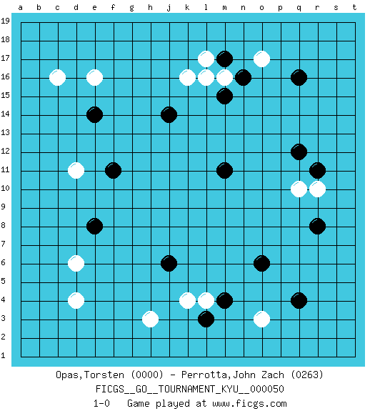 Last move : 1-0 2008 February 4 0:38:55 [Event "FICGS__GO__TOURNAMENT_KYU__000050"] [Site "FICGS"] [Date "2007.11.23"] [Round "1"] [Black "Opas,Torsten"] [White "Perrotta,John Zach"] [Result "1-0"] [Rating 1 "0000"] [Rating 2 "0263"] 1.q16 d4 2.q4 c16 3.m11 o3 4.o6 l4 5.j6 k16 6.j14 q10 7.e8 d6 8.r11 r10 9.e14 e16 10.l3 h3 11.m4 k4 12.r8 o17 13.q12 d11 14.m17 m16 15.n16 l17 16.m15 l16 17.f11 1-0 This go game has been lost on time (started : 2007.11.23 9:49:2) Here are the names of the openings (joseki) played in the four corners : Corner q4 : q4 o3 Hoshi (Hwajeom, Seongjeom, Xingwei`) 4-4 Point. The star or hoshi (4-4) point, emphasizing influence at the potential expense of territory. Ikken Kakari (Hankan Keolch'im, Yi Gua`jiao~, 1-Space Low Approach). White 2 is the standard approach move to the 4-4. Corner d4 : d4 j6 Hoshi (Hwajeom, Seongjeom, Xingwei`) 4-4 Point. The star or hoshi (4-4) point, emphasizing influence at the potential expense of territory. Corner d16 : c16 j14 Komoku (Somok, Xiao~mu`) 3-4 Point. The komoku (3-4) point is the traditional corner enclosure move.. Player Black won this Go (weiqi, baduk) game. Follow this game move after move (download)For rectangular six in the corner, dame is necessary. (Anonymous) Perseverance does not equal worthiness. Next time you want to get my attention, wear something fun. Low-riding jeans are hot. (Gregory House, House M.D.)
