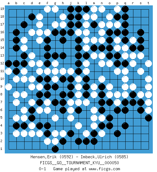 Last move : 0-1 2008 September 4 8:42:9 [Event "FICGS__GO__TOURNAMENT_KYU__000050"] [Site "FICGS"] [Date "2007.11.23"] [Round "1"] [Black "Hensen,Erik"] [White "Imbeck,Ulrich"] [Result "0-1"] [Rating 1 "0592"] [Rating 2 "0585"] 1.q16 d4 2.q4 d16 3.f3 e3 4.f4 k4 5.c13 c10 6.d5 c5 7.d6 c6 8.c4 c3 9.b4 b3 10.e4 d3 11.m3 o17 12.r14 q10 13.o15 n16 14.r8 r12 15.f17 f16 16.g16 e17 17.c7 b5 18.f15 e16 19.f18 e18 20.c17 g17 21.g18 h17 22.b16 h18 23.h15 d12 24.p18 p17 25.q17 o18 26.q18 d13 27.c12 c15 28.b15 c14 29.b14 n15 30.e8 b7 31.q6 c8 32.p3 d7 33.k6 j5 34.j16 f6 35.o14 l15 36.g7 g5 37.k2 h3 38.k17 l18 39.k18 l17 40.h13 k16 41.k15 l16 42.k14 m13 43.e7 e6 44.h16 o12 45.s10 r9 46.s9 n13 47.r10 q9 48.h2 g2 49.j3 g3 50.g1 f2 51.d18 q11 52.b11 q8 53.q7 e15 54.f14 k10 55.o7 o8 56.n7 j7 57.n8 h11 58.f12 f11 59.b9 b10 60.a10 c11 61.b12 g12 62.g13 e12 63.f13 l3 64.l2 m4 65.n4 n3 66.m2 n5 67.o4 m6 68.k12 p7 69.p6 p8 70.l8 l7 71.g9 k8 72.o5 m8 73.c9 d9 74.l9 m9 75.n14 l14 76.l13 l12 77.k13 l11 78.m14 m15 79.m17 m18 80.j18 f19 81.l19 m19 82.o19 k19 83.j17 g19 84.j19 n19 85.n9 n17 86.j10 j11 87.k11 n10 88.e10 d10 89.j9 k7 90.h8 e9 91.f10 e11 92.l10 k9 93.h10 g11 94.f9 f7 95.f8 b8 96.h7 a9 97.n6 m5 98.h6 j6 99.l19 s13 100.s14 p15 101.p16 p14 102.o16 q13 103.k19 a11 104.o13 n12 105.p13 q14 106.p12 p11 107.q12 r13 108.r11 r15 109.s16 s8 110.r7 s11 111.t11 t12 112.s12 g10 113.j8 s11 114.s7 t10 115.s15 t9 116.a12 p19 117.q19 o9 118.q15 t7 119.s6 t6 120.t5 t8 0-1 This go game has been lost on time (started : 2007.11.23 9:49:2) Here are the names of the openings (joseki) played in the four corners : Corner d4 : d4 f3 Hoshi (Hwajeom, Seongjeom, Xingwei`) 4-4 Point. The star or hoshi (4-4) point, emphasizing influence at the potential expense of territory. Ikken Kakari (Hankan Keolch'im, Yi Gua`jiao~, 1-Space Low Approach). Black 2 is the standard approach move to the 4-4. Corner d16 : d16 c13 Hoshi (Hwajeom, Seongjeom, Xingwei`) 4-4 Point. The star or hoshi (4-4) point, emphasizing influence at the potential expense of territory. Nikken Kakari (Dukan Keolch'im, E`r Gua`jiao~, 2-Space Low Approach). White typically answers by 7-3 or 3-5 (which is not joseki). Corner q16 : q16 o17 Hoshi (Hwajeom, Seongjeom, Xingwei`) 4-4 Point. The star or hoshi (4-4) point, emphasizing influence at the potential expense of territory. Ikken Kakari (Hankan Keolch'im, Yi Gua`jiao~, 1-Space Low Approach). White 2 is the standard approach move to the 4-4. Player White won this Go (weiqi, baduk) game. Follow this game move after move (download)The intersection is rarely neutral. (Pierre Audouard) Computer Science is no more about computers than astronomy is about telescopes. (Edsger W. Dijkstra)