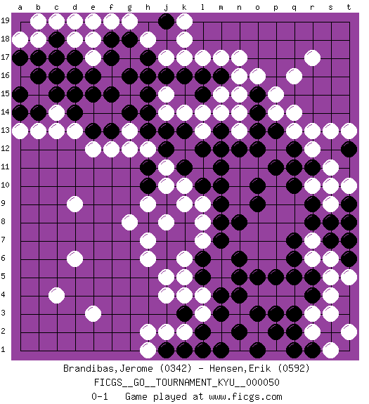 Last move : 0-1 2008 July 1 10:32:7 [Event "FICGS__GO__TOURNAMENT_KYU__000050"] [Site "FICGS"] [Date "2007.11.23"] [Round "1"] [Black "Brandibas,Jerome"] [White "Hensen,Erik"] [Result "0-1"] [Rating 1 "0342"] [Rating 2 "0592"] 1.d16 q16 2.q10 q4 3.k16 e3 4.o14 j4 5.q6 o4 6.p5 p4 7.o5 m5 8.n5 m6 9.n4 l3 10.m4 l4 11.m3 o2 12.l2 k2 13.m1 c4 14.n2 s4 15.o3 r7 16.q7 c14 17.d14 d13 18.c15 e14 19.d15 c13 20.e15 f14 21.f15 d9 22.p2 m17 23.r5 s5 24.r4 r3 25.q3 r12 26.q5 r2 27.q2 k18 28.m16 f12 29.m7 k6 30.l6 l7 31.k7 l8 32.n6 j8 33.l5 k5 34.m8 l9 35.r8 s6 36.s7 r6 37.t8 t2 38.g14 h18 39.h16 n17 40.f13 g12 41.e13 e12 42.b14 b13 43.a15 k14 44.k13 e19 45.h13 n10 46.o10 l14 47.m10 n9 48.m9 n11 49.l10 j14 50.j13 q14 51.k8 k9 52.k1 j2 53.j1 h1 54.l1 k10 55.k11 j10 56.n12 o11 57.p11 h2 58.o12 a13 59.a14 o16 60.m11 n15 61.r1 s1 62.q1 m15 63.l16 s11 64.t6 c19 65.f18 f19 66.g18 g19 67.h17 j17 68.j16 b18 69.b17 c17 70.b16 a18 71.d17 d18 72.c16 j11 73.j12 e18 74.c18 e17 75.f17 c17 76.e16 k17 77.c18 b19 78.c17 l13 79.l12 h12 80.h15 l17 81.l15 n13 82.o13 n14 83.m13 s3 84.p3 t5 85.t7 r10 86.r9 s9 87.t9 t10 88.s8 s10 89.q12 r13 90.p13 d6 91.o15 n16 92.a17 d19 93.o9 p15 94.n8 r17 95.m12 m14 96.h14 q13 97.q11 p14 98.r11 s13 99.o1 g13 100.t12 t13 101.j19 k19 102.g16 j15 103.j7 h7 104.h8 g8 105.j9 h9 106.k3 k4 107.j6 h6 108.h10 j8 109.h11 j5 0-1 Here are the names of the openings (joseki) played in the four corners : Corner q16 : q16 o14 Hoshi (Hwajeom, Seongjeom, Xingwei`) 4-4 Point. The star or hoshi (4-4) point, emphasizing influence at the potential expense of territory. Corner q4 : q4 q6 Hoshi (Hwajeom, Seongjeom, Xingwei`) 4-4 Point. The star or hoshi (4-4) point, emphasizing influence at the potential expense of territory. Ikken Takagakari (Hankan Nop'dakeolch'im, Yi Gaojia, 1-Space High Approach). White typically responds at 6-4 or 3-10. White 4-10 is played when White finds play on the right side advantageous. White 4-8 or 3-8 may be played when White has support at top. Corner d16 : d16 c14 Hoshi (Hwajeom, Seongjeom, Xingwei`) 4-4 Point. The star or hoshi (4-4) point, emphasizing influence at the potential expense of territory. Ikken Kakari (Hankan Keolch'im, Yi Gua`jiao~, 1-Space Low Approach). White 2 is the standard approach move to the 4-4. Player White won this Go (weiqi, baduk) game. Follow this game move after move (download)While the Baroque rules of chess could only have been created by humans, the rules of go are so elegant, organic, and rigorously logical that if intelligent life forms exist elsewhere in the universe, they almost certainly play go. (Edward Lasker, international chess master) A good teacher is like a candle - it consumes itself to light the way for others. (Author unknown)