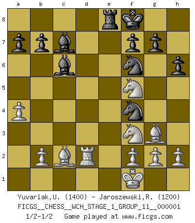 Last move : 1/2-1/2 2006 September 22 16:46:28 [Event "FICGS__CHESS__WCH_STAGE_1_GROUP_11__000001"] [Site "FICGS"] [Date "2006.07.01"] [Round "1"] [White "Yuvarlak,Ugur"] [Black "Jaroszewski,Rodrigo"] [Result "1/2-1/2"] [WhiteElo "1400"] [BlackElo "1200"] 1.d4 Nf6 2.Nf3 e6 3.e3 Bb4+ 4.c3 Ba5 5.Bd3 d5 6.Nbd2 Nbd7 7.O-O c5 8.Re1 O-O 9.Qe2 Re8 10.Bc2 Bb6 11.e4 cxd4 12.cxd4 e5 13.exd5 exd4 14.Qd1 Rxe1+ 15.Qxe1 Nxd5 16.Nb3 N7f6 17.Nbxd4 Qd6 18.Bg5 Bd7 19.Qd2 Re8 20.Nf5 Qb4 21.Rd1 Qxd2 22.Rxd2 h6 23.Bh4 Bc7 24.Kf1 Kf8 25.Bg3 Nf4 26.a4 Bc6 1/2-1/2 Queen's pawn : Yusupov-Rubinstein system Kingside Castling by player White (move 7) Kingside Castling by player Black (move 8) This chess game ended in a draw. Follow this game move after move (download)I love all positions. Give me a difficult positional game, I will play it. But totally won positions, I cannot stand them. (Hein Donner) Ich trinke, ich rauche, ich spiele, ich liebe Frauen aber Fernschach ist ein Laster, das ich nicht habe. (Mikhail Nekhemyevich Tal) Cuando tengas duda... ¡juega al Ajedrez!. (Tevis) Aux échecs, les retours au sommet sont rares : les dommages psychologiques consécutifs à une défaite sont trop sévères. (Daily Telegraph) The existence of forgetting has never been proved: We only know that some things don't come to mind when we want them. (Friedrich Nietzsche)
