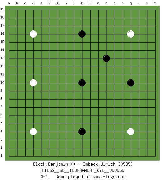 Last move : 0-1 2007 December 1 15:34:12 [Event "FICGS__GO__TOURNAMENT_KYU__000050"] [Site "FICGS"] [Date "2007.11.23"] [Round "1"] [Black "Block,Benjamin"] [White "Imbeck,Ulrich"] [Result "0-1"] [Rating 2 "0585"] 1.q10 q4 2.k4 d4 3.k10 q16 4.k16 d16 5.n13 d10 0-1 Here are the names of the openings (joseki) played in the four corners : Corner q16 : q16 n13 Hoshi (Hwajeom, Seongjeom, Xingwei`) 4-4 Point. The star or hoshi (4-4) point, emphasizing influence at the potential expense of territory. Corner d4 : d4 0-1 Hoshi (Hwajeom, Seongjeom, Xingwei`) 4-4 Point. The star or hoshi (4-4) point, emphasizing influence at the potential expense of territory. Player White won this Go (weiqi, baduk) game. Follow this game move after move (download)Sacrifice for shape. (Anonymous) Beep ! (R2D2 in Star Wars ep.3)