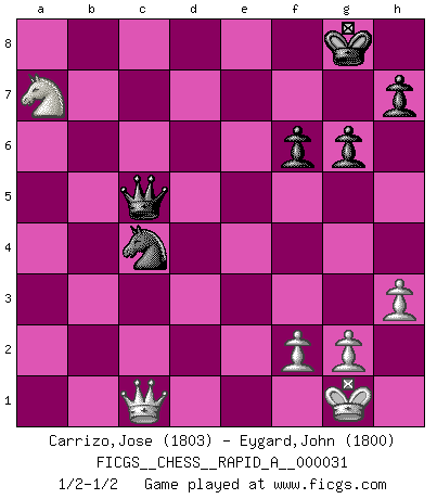Last move : 1/2-1/2 2008 February 18 3:8:5 [Event "FICGS__CHESS__RAPID_A__000031"] [Site "FICGS"] [Date "2007.11.23"] [Round "1"] [White "Carrizo,Jose"] [Black "Eygard,John"] [Result "1/2-1/2"] [WhiteElo "1803"] [BlackElo "1800"] 1.e4 Nf6 2.e5 Nd5 3.d4 d6 4.Nf3 g6 5.Bc4 Nb6 6.Bb3 Bg7 7.a4 dxe5 8.a5 N6d7 9.Bxf7+ Kxf7 10.Ng5+ Kg8 11.Ne6 Qe8 12.Nxc7 Qd8 13.Nxa8 exd4 14.O-O Nc6 15.Re1 Nc5 16.Bd2 d3 17.c3 Bf6 18.b4 Ne6 19.Qb3 Kg7 20.a6 bxa6 21.Rxe6 Bxe6 22.Qxe6 Nxb4 23.Qc4 Nd5 24.Qxd3 Qxa8 25.Rxa6 Rd8 26.Qf1 Qb7 27.h3 Rd7 28.Ra3 Qb2 29.c4 Nb4 30.Bc3 Qc2 31.Bxf6+ exf6 32.Rc3 Qb2 33.Re3 Nc2 34.Re2 Qb3 35.Nd2 Qa4 36.Nf3 Na3 37.Rd2 Rb7 38.Ra2 Qb3 39.Ra1 Nxc4 40.Nd4 Qb4 41.Qc1 Kg8 42.Nc6 Qc5 43.Rxa7 Rxa7 44.Nxa7 1/2-1/2 Alekhine's defense : Modern, Keres variation Kingside Castling by player White (move 14) This chess game ended in a draw. Follow this game move after move (download)Chess is 99 percent tactics. (Teichmann) Ein Gewinn durch eine ungenaue Kombination, sei sie auch noch so vorzeigbar, erfüllt mich mit Schaudern. (Wilhelm Steinitz) El ganar no lo es todo... pero el perder es nada. (Mednis) La vérité est comme le meilleur coup aux échecs : elle existe, mais il faut la chercher. (Arturo Perez-Reverte) Pretend inferiority and encourage his arrogance. (Sun Tzu)