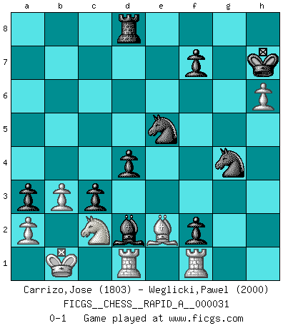 Last move : 0-1 2008 March 29 2:13:4 [Event "FICGS__CHESS__RAPID_A__000031"] [Site "FICGS"] [Date "2007.11.23"] [Round "1"] [White "Carrizo,Jose"] [Black "Weglicki,Pawel"] [Result "0-1"] [WhiteElo "1803"] [BlackElo "2000"] 1.e4 c5 2.Nf3 d6 3.d4 cxd4 4.Nxd4 Nf6 5.Nc3 Nc6 6.Bg5 Qb6 7.Nb3 e6 8.Qd2 Be7 9.O-O-O O-O 10.f3 a6 11.h4 Rd8 12.h5 h6 13.Be3 Qc7 14.Qf2 Re8 15.g4 b5 16.g5 hxg5 17.h6 g6 18.Bxg5 b4 19.Na4 Kh7 20.Be3 Bb7 21.Bb6 Qc8 22.Be3 Qc7 23.Kb1 Ne5 24.Bd4 Rac8 25.Rh3 Rb8 26.Nb6 Bd8 27.Qh2 Bxe4 28.fxe4 Rxb6 29.Bxb6 Qxb6 30.Qf4 Rg8 31.Bg2 g5 32.Qf1 g4 33.Rh1 Nfd7 34.Nd4 Bg5 35.Qe2 Nf6 36.Rhf1 a5 37.Rh1 Rb8 38.Rhg1 a4 39.Bh3 Rg8 40.Bg2 a3 41.b3 Qc5 42.c4 bxc3 43.Nc2 Bd2 44.Rh1 g3 45.Bf3 Qf2 46.Qxf2 gxf2 47.Rhf1 Nfg4 48.Be2 d5 49.exd5 exd5 50.Rh1 Rd8 51.Rhf1 d4 0-1 Sicilian : Richter-Rauzer Queenside Castling by player White (move 9) Kingside Castling by player Black (move 9) Player Black won this chess game. Follow this game move after move (download)There must have been a time when men were demigods, or they could not have invented Chess. (Gustav Schenk) Es genügt nicht ein guter Spieler zu sein, man muß auch gut spielen. (Siegbert Tarrasch) En la vida, como en el Ajedrez, los Peones propios obstruyen nuestro camino. La gran fortuna de un hombre, su comodidad, placer, hijos, libros, que deberían ayudarle a ganar, con mucha frecuencia lo ponen en Jaque Mate. (Charles Buxton) Aux échecs, l'amour-propre est satisfait quand on remporte la victoire, mais il n'y a pas de honte à être battu. (Benjamin Franklin) Tree pose grows confidence. It roots me to this world. (Terri Guillemets)