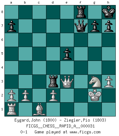 Last move : 0-1 2007 December 17 0:47:42 [Event "FICGS__CHESS__RAPID_A__000031"] [Site "FICGS"] [Date "2007.11.23"] [Round "1"] [White "Eygard,John"] [Black "Ziegler,Pio"] [Result "0-1"] [WhiteElo "1800"] [BlackElo "1803"] 1.e4 e5 2.Nf3 Nc6 3.Bc4 Nf6 4.Ng5 d5 5.exd5 Na5 6.Bb5+ c6 7.dxc6 bxc6 8.Qf3 Be7 9.Bxc6+ Nxc6 10.Qxc6+ Bd7 11.Qf3 O-O 12.O-O Ng4 13.Ne4 f5 14.Ng3 Rc8 15.Qd5+ Kh8 16.Nc3 Qc7 17.Nb5 Bxb5 18.Qxb5 Qxc2 19.h3 Nxf2 20.Rxf2 Bc5 21.Qb3 Bxf2+ 22.Kxf2 f4 23.Ne2 Qf5 24.Qd5 Rcd8 25.Qc5 f3 26.Ng3 Qf7 27.Qe3 fxg2 28.Kxg2 Rd3 0-1 Two knights defense Kingside Castling by player Black (move 11) Kingside Castling by player White (move 12) Player Black won this chess game. Follow this game move after move (download)I prefer to lose a really good game than to win a bad one. (David Levy) Charakterschwächen offenbaren sich normalerweise während einer Schachpartie. (Garry Kasparov) Me siento como si fuera una pieza en una partida de Ajedrez, cuando mi oponente me indica: esa pieza no puede ser movida. (Soren Kierkegaard) Mon pion favori sur ma case favorite ! Bronstein en parlant d'un coup de pion en h5 quand il avait les Noirs. That's absurd. I love it. (Gregory House, House M.D.)