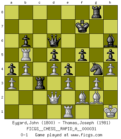 Last move : 0-1 2007 December 18 3:30:36 [Event "FICGS__CHESS__RAPID_A__000031"] [Site "FICGS"] [Date "2007.11.23"] [Round "1"] [White "Eygard,John"] [Black "Thomas,Joseph"] [Result "0-1"] [WhiteElo "1800"] [BlackElo "1981"] 1.c4 f5 2.Nc3 Nf6 3.Nf3 g6 4.d4 Bg7 5.g3 O-O 6.Bg2 d6 7.O-O c6 8.Qd3 Na6 9.a3 Nc7 10.Bd2 Bd7 11.Rfe1 a5 12.b4 Re8 13.c5 Ncd5 14.Ng5 h6 15.Nxd5 cxd5 16.Nh3 e5 17.cxd6 e4 18.Qb1 a4 19.Nf4 Kf7 20.h4 Bb5 21.Rc1 Qxd6 22.Qa2 g5 23.Rc5 gxf4 24.Rxb5 b6 25.e3 fxg3 26.fxg3 h5 27.Be1 Bh6 28.Bf2 Rac8 29.Qd2 Ng4 30.Re1 Rg8 31.Kh1 Rc3 0-1 English : Anglo-Dutch defense Kingside Castling by player Black (move 5) Kingside Castling by player White (move 7) Player Black won this chess game. Follow this game move after move (download)Chess is imagination. (David Bronstein) Wenn es im Universum noch irgendwo intelligente Lebewesen gibt, dann kennen sie Go. (Emanuel Lasker) Un entendimiento minucioso de las típicas continuaciones de mate hacen de las mas complicadas combinaciones de sacrificio que conducen hacia ellas no solo no dificiles, sino casi un asunto de rutina. (Siegbert Tarrasch) On est toujours la mazette de quelqu'un d'autre. (Anonyme) Luck has a peculiar habit of favoring those who don't depend on it. (Author unknown)