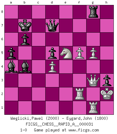 Last move : 1-0 2008 March 12 4:42:18 [Event "FICGS__CHESS__RAPID_A__000031"] [Site "FICGS"] [Date "2007.11.23"] [Round "1"] [White "Weglicki,Pawel"] [Black "Eygard,John"] [Result "1-0"] [WhiteElo "2000"] [BlackElo "1800"] 1.e4 c5 2.Nc3 Nc6 3.Nf3 Nf6 4.Bb5 a6 5.Bxc6 dxc6 6.d3 Qc7 7.e5 Nd5 8.O-O Bf5 9.Ne4 O-O-O 10.Nxc5 e6 11.Nb3 Be7 12.Bd2 g5 13.Qe2 h6 14.Nfd4 Bg6 15.h3 h5 16.Ba5 b6 17.Bd2 c5 18.Nf3 g4 19.Ng5 Nb4 20.Bf4 gxh3 21.Nxh3 Rhg8 22.Bh2 Bf5 23.Nf4 h4 24.Kh1 Qc6 25.f3 Kb7 26.a3 Nd5 27.a4 a5 28.Nxd5 exd5 29.Bf4 Rde8 30.Rfe1 Bd7 31.Qf2 Qe6 32.Re2 Bc6 33.d4 c4 34.Nd2 Qf5 35.Qe3 Qxc2 36.b3 cxb3 37.Nxb3 Qg6 38.Rb2 Ka7 39.Nc1 Rc8 40.Qb3 Bb7 41.Rab1 Rc6 42.Na2 Ba6 43.Rd1 h3 44.g3 Bc4 45.Qe3 Rd8 46.Rc1 Kb7 47.Kh2 Rh8 48.g4 R6c8 49.Rbc2 Bf8 50.Rb2 Rh7 51.Rh1 Be7 52.Nc3 Bb4 53.Kg3 f5 54.exf6 Qxf6 55.Be5 Qh4+ 56.Kh2 Qe7 57.f4 Ba3 58.Rf2 Qd7 59.f5 Bb4 60.g5 Rh5 61.Rg1 Bb3 62.Ne2 Bxa4 63.Nf4 Rh4 64.Qg3 R4h8 65.Bxh8 Rxh8 66.Ng6 Rg8 67.Ne5 1-0 Sicilian : Closed, 2...Nc6 Kingside Castling by player White (move 8) Queenside Castling by player Black (move 9) Player White won this chess game. Follow this game move after move (download)Everything is in a state of flux, and this includes the world of Chess. (Mikhail Botvinnik) Um dein Spiel zu verbessern musst du zuallererst das Endspiel studieren, denn diese kann unabhängig studiert werden. Die Eröffnung und das Mittelspiel müssen immer in Bezug gesetzt werden zum Endspiel. (José Raúl Capablanca) El Ajedrez lo es todo: arte, ciencia y deporte. (Anatoly Karpov) La tactique est l'élément le plus important du milieu de jeu. (Siegbert Tarrasch) The best weapon against an enemy is another enemy. (Friedrich Nietzsche)