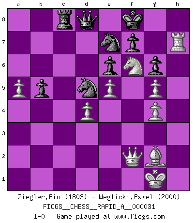 Last move : 1-0 2008 March 14 17:54:31 [Event "FICGS__CHESS__RAPID_A__000031"] [Site "FICGS"] [Date "2007.11.23"] [Round "1"] [White "Ziegler,Pio"] [Black "Weglicki,Pawel"] [Result "1-0"] [WhiteElo "1803"] [BlackElo "2000"] 1.d4 Nf6 2.c4 Nc6 3.Nf3 e6 4.Nc3 Bb4 5.e3 d6 6.Bd2 O-O 7.Qc2 d5 8.a3 Be7 9.Bd3 dxc4 10.Bxc4 b6 11.O-O h6 12.Ne4 Bb7 13.Bd3 Ne8 14.Rfe1 Qd7 15.Rac1 a6 16.Ng3 Nf6 17.b4 Rac8 18.Ne2 Rfd8 19.Qb1 Qe8 20.e4 Na7 21.Bf4 Rd7 22.Rf1 Nh5 23.Be3 Nf6 24.Ne5 R7d8 25.f3 Nd7 26.Nc4 Nc6 27.Qc2 Nf6 28.Rfd1 b5 29.Nd2 Nd7 30.Nb3 Ba8 31.Qa2 Bf6 32.Bf2 g6 33.Qd2 Bg7 34.Rc2 Ne7 35.Rdc1 c6 36.e5 Nb6 37.Nc3 Nf5 38.g4 Ne7 39.Ne4 Qf8 40.f4 Rc7 41.Bh4 Kh8 42.Qf2 Nbd5 43.Nbc5 Ra7 44.Qd2 Rb8 45.Kh1 Qg8 46.Ra2 Qf8 47.Rg1 Qg8 48.a4 Qf8 49.Rga1 Rb6 50.Be2 Rb8 51.axb5 cxb5 52.Kg1 Rb6 53.Nd6 Bc6 54.Bd3 Nc8 55.Nde4 Nce7 56.Ra3 Qb8 57.Nxa6 Qa8 58.Nec5 Bf8 59.Ra5 Qc8 60.Be2 h5 61.h3 hxg4 62.hxg4 Bh6 63.Bg3 Kg8 64.Bf1 Bf8 65.Bh4 Bh6 66.Bg5 Bxg5 67.fxg5 Kg7 68.R1a3 Ra8 69.Qf2 Qd8 70.Bg2 Bb7 71.Nxb7 Rxb7 72.Nc5 R7b8 73.Rf3 Qg8 74.Nd7 Rc8 75.Rh3 Qd8 76.Nf6 Rxa5 77.Rh7+ Kf8 78.bxa5 1-0 Kevitz-Trajkovich defense Kingside Castling by player Black (move 6) Kingside Castling by player White (move 11) Player White won this chess game. Follow this game move after move (download)Chess is in its essence a game, in its form an art, and in its execution a science. (Baron Tassilo) Ein Schachspiel besteht aus drei Phasen: Die erste, wenn du hofftst den Vorteil zu haben, die zweite, wenn du glaubst einen Vorteil zu haben, und die dritte.... wenn du weißt Du wirst verlieren. (Savielly Grigorievitsch Tartakower) Yo jugué Ajedrez con el y a veces le pude haber ganado solo que siempre devuelve su última jugada y juega la partida de manera diferente. (Mark Twain) C'est la seule position que je connaisse où les deux camps sont mals. Propos prêtés à V. Anand. He who laughs last probably does not get the joke. (Unknown)