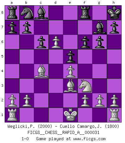Last move : 1-0 2008 January 16 23:22:12 [Event "FICGS__CHESS__RAPID_A__000031"] [Site "FICGS"] [Date "2007.11.23"] [Round "1"] [White "Weglicki,Pawel"] [Black "Cuello Camargo,Jose Javier"] [Result "1-0"] [WhiteElo "2000"] [BlackElo "1800"] 1.d4 Nf6 2.c4 g6 3.Nc3 Bg7 4.e4 d6 5.Nf3 O-O 6.Be2 e5 7.dxe5 dxe5 8.Qxd8 Rxd8 9.Bg5 Rf8 10.Nd5 Nxd5 11.cxd5 c6 12.d6 f6 13.Bc4+ Kh8 14.Be3 1-0 This chess game has been lost on time (started : 2007.11.23 18:27:57) King's Indian : Andersson variation Kingside Castling by player Black (move 5) Player White won this chess game. Follow this game move after move (download)The only thing Chess players have in common is Chess. (Lodewijk Prins) Wenn man heute mit 14 Jahren noch kein GM ist, kann man es vergessen. (Viswanathan Anand) No existe un remordimiento como el remordimiento del Ajedrez. (H. G. Wells) Les sacrifices démontrent seulement que quelqu'un a gaffé. (Savielly Tartacover) Perception is reality. (Immanuel Kant)