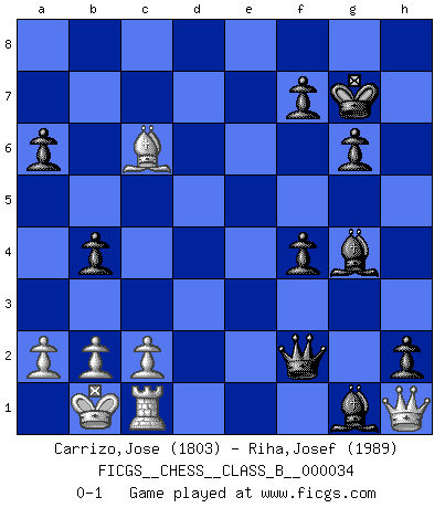 Last move : 0-1 2008 February 25 22:12:3 [Event "FICGS__CHESS__CLASS_B__000034"] [Site "FICGS"] [Date "2007.11.24"] [Round "1"] [White "Carrizo,Jose"] [Black "Riha,Josef"] [Result "0-1"] [WhiteElo "1803"] [BlackElo "1989"] 1.e4 c5 2.Nf3 d6 3.d4 cxd4 4.Nxd4 Nf6 5.Nc3 Nc6 6.Bg5 e6 7.Qd2 a6 8.O-O-O h6 9.Be3 Be7 10.f3 Nxd4 11.Bxd4 b5 12.Kb1 Bb7 13.g4 Qc7 14.Qf2 b4 15.Na4 e5 16.Be3 d5 17.Nb6 Rd8 18.exd5 Nxd5 19.Nxd5 Rxd5 20.Bd3 O-O 21.Rhg1 Qd8 22.g5 hxg5 23.h4 gxh4 24.Bh6 Bf6 25.Qg2 g6 26.Bxf8 Kxf8 27.Qf1 Bc8 28.Qe2 h3 29.Bc4 Rxd1+ 30.Rxd1 Qb6 31.Bb3 Qc5 32.Bd5 Kg7 33.Bb3 Bg5 34.Qf1 h2 35.Bd5 Be3 36.Qh1 Bg1 37.Be4 Qf2 38.Bc6 Bh3 39.f4 Bg4 40.Rc1 exf4 0-1 Sicilian : Richter-Rauzer, Rauzer attack, 7...a6 Queenside Castling by player White (move 8) Kingside Castling by player Black (move 20) Player Black won this chess game. Follow this game move after move (download)Life is like a game of Chess, changing with each move. (Chinese proverb) Computer sind die einzigen Gegner, die nicht immer eine Ausrede auf Lager haben, wenn sie gegen mich verlieren. (Robert James Fischer) Fischer es una tragedia del Ajedrez Americano a la par con Morphy y Pillsbury. (Mig Greengard) Même si vous avez un bon coup à faire, regardez toujours s'il n'y en a pas un qui lui soit préférable. (Pedro Damiano) The modern world has divided itself into Conservatives and Progressives. The business of Progressives is to go on making mistakes. The business of the Conservatives is to prevent the mistakes from being corrected. (G.K. Chesterton)