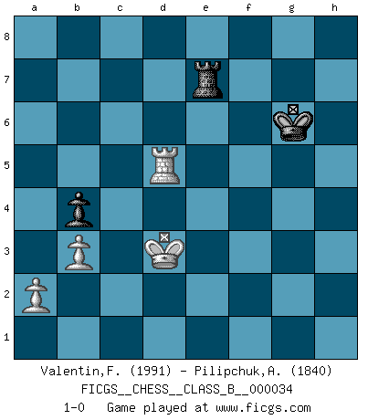 Last move : 1-0 2008 April 28 21:19:57 [Event "FICGS__CHESS__CLASS_B__000034"] [Site "FICGS"] [Date "2007.11.24"] [Round "1"] [White "Valentin,Florea"] [Black "Pilipchuk,Andrey"] [Result "1-0"] [WhiteElo "1991"] [BlackElo "1840"] 1.e4 c6 2.d4 d5 3.e5 Bf5 4.Nc3 a6 5.Be3 Qc7 6.g4 Bd7 7.Qe2 e6 8.Nf3 c5 9.O-O-O cxd4 10.Nxd4 Nc6 11.Nxc6 Bxc6 12.Bd4 b5 13.Qe3 Ne7 14.Bd3 b4 15.Ne2 Bb5 16.Kb1 h5 17.h3 Bxd3 18.Qxd3 Qc4 19.Qd2 Nc6 20.b3 Qb5 21.f4 a5 22.f5 a4 23.Nf4 Nxd4 24.Qxd4 Bc5 25.Qd2 Qb6 26.Qe2 axb3 27.cxb3 Be3 28.Rhf1 O-O 29.gxh5 Bxf4 30.Rxf4 exf5 31.Rxf5 Ra5 32.Qf2 Qxf2 33.Rxf2 Re8 34.Re2 Kh7 35.Rd4 f6 36.e6 Rb5 37.Kc2 Kh6 38.Rd1 Kxh5 39.Kd3 g5 40.Rf1 Kg6 41.h4 Rb6 42.hxg5 fxg5 43.Rfe1 Kf6 44.e7 Rb7 45.Rf2+ Kg6 46.Re6+ Kg7 47.Re5 Kg6 48.Rg2 R8xe7 49.R2xg5+ Kf6 50.Rgf5+ Kg6 51.Rxe7 Rxe7 52.Rxd5 1-0 Caro-Kann : Advance variation Queenside Castling by player White (move 9) Kingside Castling by player Black (move 28) 10 pieces endgame at move 49 : White KRRPP , Black KRRPP WHITE : King + 2 Rooks 2 Pawns BLACK : King + 2 Rooks 2 Pawns 9 pieces endgame at move 51 : White KRRPP , Black KRPP WHITE : King + 2 Rooks 2 Pawns BLACK : King + 1 Rook 2 Pawns 8 pieces endgame at move 51 : White KRPP , Black KRPP WHITE : King + 1 Rook 2 Pawns BLACK : King + 1 Rook 2 Pawns 7 pieces endgame at move 52 : White KRPP , Black KRP WHITE : King + 1 Rook 2 Pawns BLACK : King + 1 Rook 1 Pawn Player White won this chess game. Follow this game move after move (download)One doesn't have to play well, it's enough to play better than your opponent. (Siegbert Tarrasch) Ich verlor meine Bürgerrechte, mein Gehalt wurde mir nicht mehr bezahlt und ich wurde zensiert und durfte nicht mehr ins Ausland reisen. [nach dem Match Fischer-Taimanov 6:0] (Mark Taimanov) El jugador blanco perdió porque fallo en recordar la coreccta continuación y tuvo que pensar por sí mismo las movidas. (Siegbert Tarrasch) Ne tendez aucun piège pour le plaisir ! Ne jouez rien dans l'espoir que l'adversaire réagisse de façon stupide ! Prenez toujours pour acquis que l'adversaire va trouver le meilleur coup ! Ne jouez jamais de coup dans l'espoir que l'adversaire ne voie pas la menace ! Chacun de vos coups doit améliorer la position d'une façon ou d'une autre. Somewhere in the world there is an epigram for every dilemma. (Hendrik Willem van Loon)