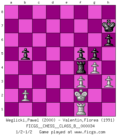 Last move : 1/2-1/2 2008 February 20 19:22:25 [Event "FICGS__CHESS__CLASS_B__000034"] [Site "FICGS"] [Date "2007.11.24"] [Round "1"] [White "Weglicki,Pawel"] [Black "Valentin,Florea"] [Result "1/2-1/2"] [WhiteElo "2000"] [BlackElo "1991"] 1.e4 c5 2.Nf3 Nc6 3.Bb5 g6 4.Nc3 Bg7 5.O-O Nd4 6.Bc4 d6 7.Nxd4 cxd4 8.Ne2 Nf6 9.d3 d5 10.Bb5+ Bd7 11.Nxd4 dxe4 12.dxe4 Nxe4 13.Qe2 Nd6 14.Bxd7+ Qxd7 15.Rd1 Rc8 16.a4 a6 17.Bg5 h6 18.Bh4 Rc4 19.Qe3 g5 20.Bg3 O-O 21.Be5 Bxe5 22.Qxe5 Rfc8 23.h3 R8c5 24.Qe3 Nf5 25.Nxf5 Qxf5 26.Rd8+ Kh7 27.g4 Qxc2 28.Qxe7 Rf4 29.Rf1 Rc8 30.Rd4 Rc7 31.Qb4 Rc4 32.Rxc4 Qxc4 33.Qxb7 Qxa4 34.Qb6 Qb5 35.Qxb5 axb5 36.f3 f5 37.Kf2 1/2-1/2 Sicilian : Nimzovich-Rossolimo attack (with ...g6, without ...d6) Kingside Castling by player White (move 5) Kingside Castling by player Black (move 20) This chess game ended in a draw. Follow this game move after move (download)I have never in my life played the French Defence, which is the dullest of all openings. (Wilhelm Steinitz) Es genügt nicht ein guter Spieler zu sein, man muß auch gut spielen. (Siegbert Tarrasch) El Ajedrez tiene tanto misterio como las mujeres. (Purdy) Les échecs, c'est l'art d'analyser. (Mikhail Botvinnik) Life is like a play: it's not the length but the excellence of the acting that matters. (Seneca)