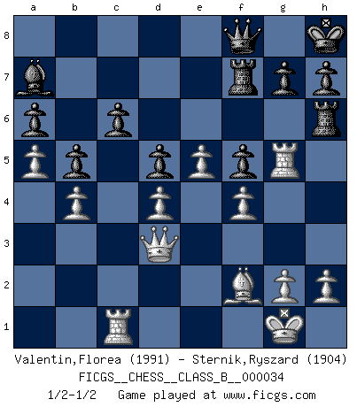 Last move : 1/2-1/2 2008 January 20 9:8:43 [Event "FICGS__CHESS__CLASS_B__000034"] [Site "FICGS"] [Date "2007.11.24"] [Round "1"] [White "Valentin,Florea"] [Black "Sternik,Ryszard"] [Result "1/2-1/2"] [WhiteElo "1991"] [BlackElo "1904"] 1.e4 e5 2.Nf3 Nc6 3.Bb5 a6 4.Ba4 Nf6 5.O-O Nxe4 6.d4 b5 7.Bb3 d5 8.dxe5 Be6 9.Nbd2 Nc5 10.c3 Nxb3 11.Nxb3 Be7 12.Nfd4 Qd7 13.Nxe6 Qxe6 14.f4 O-O 15.Be3 Rad8 16.Nd4 Nxd4 17.cxd4 f5 18.Rc1 c6 19.Bd2 Rc8 20.b4 Bd8 21.Rf3 Bb6 22.Bc3 Rce8 23.a4 Qf7 24.a5 Ba7 25.Rg3 Re6 26.Be1 Qe7 27.Qd2 Rh6 28.Bf2 Re8 29.Rg5 Rf8 30.Qc3 Rf7 31.Qb2 Kh8 32.Qb1 Qf8 33.Rg3 Re7 34.Rg5 Rf7 35.Qb3 Qe7 36.Qd3 Qf8 1/2-1/2 Ruy Lopez : Open, 7.Bb3 Kingside Castling by player White (move 5) Kingside Castling by player Black (move 14) This chess game ended in a draw. Follow this game move after move (download)I know people who have all the will in the world, but still can't play good Chess. (Bobby Fischer) Die Elozahlen sind sehr schlecht für das Schach. Jetzt ist Schach eine Sportindustrie, die darauf zielt Elopunkte zu machen. (Miguel Najdorf) Yo creo que el Ajedrez posee una magia que es también una ayuda en la edad avanzada. Una rodilla reumática es olvidada durante una partida de Ajedrez y otros eventos pueden parecer algo sin importancia comparada a una catástrofe en el tablero de Ajedrez. (Vlastimil Hort) On n'a jamais que l'âge auquel on a commence à jouer aux échecs car après on cesse de vieillir. (Capablanca) Perseverance does not equal worthiness. Next time you want to get my attention, wear something fun. Low-riding jeans are hot. (Gregory House, House M.D.)
