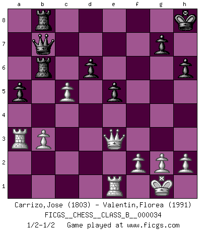 Last move : 1/2-1/2 2008 May 24 12:26:12 [Event "FICGS__CHESS__CLASS_B__000034"] [Site "FICGS"] [Date "2007.11.24"] [Round "1"] [White "Carrizo,Jose"] [Black "Valentin,Florea"] [Result "1/2-1/2"] [WhiteElo "1803"] [BlackElo "1991"] 1.e4 c5 2.Nf3 Nc6 3.d4 cxd4 4.Nxd4 Nf6 5.Nc3 e5 6.Ndb5 d6 7.Bg5 a6 8.Na3 b5 9.Nd5 Be7 10.Bxf6 Bxf6 11.c3 Bg5 12.Nc2 O-O 13.a4 bxa4 14.Rxa4 a5 15.Bc4 Rb8 16.Ra2 Kh8 17.Nce3 Bxe3 18.Nxe3 Ne7 19.O-O f5 20.exf5 Nxf5 21.Nxf5 Bxf5 22.Qd2 Qc7 23.Bd5 Bd7 24.b3 Bc6 25.Bxc6 Qxc6 26.Ra3 h6 27.Qe3 Rb6 28.c4 Rfb8 29.Re1 Qb7 30.c5 1/2-1/2 Sicilian : Pelikan (Lasker/Sveshnikov) variation Kingside Castling by player Black (move 12) Kingside Castling by player White (move 19) This chess game ended in a draw. Follow this game move after move (download)Chess makes man wiser and clear-sighted. (Vladimir Putin) Es ist peinlich, dass ich nie Weltmeister wurde. Es wäre leicht, Leonid Breschnjew als Ursache vorzuschieben, dessen Apparat den Vorzeigekommunisten Anatoli Karpow in allem unterstützte. Aber Garri Kasparow zum Beispiel, der ebenfalls von den Sowjets unerwünscht war, hat trotz der Widerstände den WM-Titel erobert. (Viktor Kortschnoi) Fischer es una tragedia del Ajedrez Americano a la par con Morphy y Pillsbury. (Mig Greengard) La victoire dans une partie d'Echecs appartient la plupart du temps à celui qui voit un peu plus loin que l'adversaire. (Lasker) Is not life a hundred times too short to bore ourselves ? (Friedrich Nietzsche)