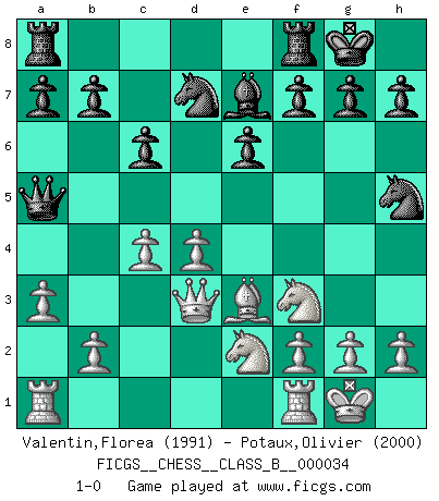 Last move : 1-0 2008 February 16 13:33:54 [Event "FICGS__CHESS__CLASS_B__000034"] [Site "FICGS"] [Date "2007.11.24"] [Round "1"] [White "Valentin,Florea"] [Black "Potaux,Olivier"] [Result "1-0"] [WhiteElo "1991"] [BlackElo "2000"] 1.e4 d5 2.exd5 Qxd5 3.Nc3 Qa5 4.d4 c6 5.Nf3 Bf5 6.Bc4 e6 7.O-O Nd7 8.Bf4 Bb4 9.Ne2 Ngf6 10.a3 Be7 11.Bd3 Bxd3 12.Qxd3 O-O 13.c4 Nh5 14.Be3 1-0 Scandinavian (centre counter) defense Kingside Castling by player White (move 7) Kingside Castling by player Black (move 12) Player White won this chess game. Follow this game move after move (download)The essence of Chess is thinking about what Chess is. (David Bronstein) Kasparov ist eine Art Monster mit hundert Augen, denen auch nicht das Geringste entgeht. (Tony Miles) El poder defensivo de una pieza clavada, solamente es imaginario. (Aaron Nimzovich) Aucun coup ne doit être joué sans but. (Pedro Damiano) When you stop learning you start dying. (M. Scott Adams)