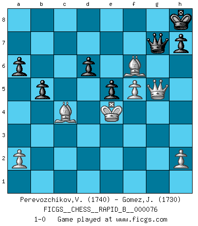 Last move : 1-0 2008 March 20 18:1:44 [Event "FICGS__CHESS__RAPID_B__000076"] [Site "FICGS"] [Date "2007.11.26"] [Round "1"] [White "Perevozchikov,Vjacheslav"] [Black "Gomez,Jose"] [Result "1-0"] [WhiteElo "1740"] [BlackElo "1730"] 1.Nf3 Nf6 2.c4 c5 3.Nc3 e6 4.g3 b6 5.Bg2 Bb7 6.O-O a6 7.Re1 d6 8.e4 Be7 9.d4 cxd4 10.Nxd4 Qc7 11.Be3 Nbd7 12.Rc1 Rc8 13.f4 O-O 14.g4 Nc5 15.Bf2 g6 16.f5 gxf5 17.gxf5 e5 18.Nc2 Kh8 19.b4 Ncxe4 20.Nxe4 Rg8 21.Bg3 Bxe4 22.Bxe4 Qxc4 23.Bb7 Rce8 24.Ne3 Qxb4 25.Rc7 b5 26.Kh1 Rg7 27.Nd5 Qa5 28.Rxe7 Rxe7 29.Bh4 Nxd5 30.Bxd5 f6 31.Bxf6 Qd8 32.Rg1 Qf8 33.Rxg7 Qxg7 34.Qg4 Rc7 35.Qg5 Rc1+ 36.Kg2 Rc7 37.Kf3 Rc3+ 38.Ke4 Rc4+ 39.Bxc4 1-0 Reti Opening Kingside Castling by player White (move 6) Kingside Castling by player Black (move 13) Player White won this chess game. Follow this game move after move (download)Chess is mental torture. (Garry Kasparov) Spielt Blackmar-Diemer-Gambit, und das Matt kommt von selbst! (Emil Joseph Diemer) No solamente yo pronostico su triunfo sobre Botvinnik, sino que me adelanto y digo que probablemente Fischer es el jugador de Ajedrez mas grande que haya existido. (John Collins) Demandez au pauvre Cg1 ce qu'il en pense. Eduard Gufeld à propos de la variante Saemisch de l'Est-Indienne. Shallow men believe in luck. Strong men belive in cause and effect. (Ralph Waldo Emerson)