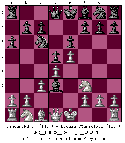 Last move : 0-1 2008 January 8 10:57:38 [Event "FICGS__CHESS__RAPID_B__000076"] [Site "FICGS"] [Date "2007.11.26"] [Round "1"] [White "Candan,Adnan"] [Black "Dsouza,Stanislaus"] [Result "0-1"] [WhiteElo "1400"] [BlackElo "1600"] 1.e4 Nc6 2.d4 d5 3.e5 Bf5 4.c3 e6 5.Nf3 a6 6.Bd3 Bxd3 0-1 This chess game has been lost on time (started : 2007.11.26 2:17:45) KP : Nimzovich defense Player Black won this chess game. Follow this game move after move (download)Those who say they understand Chess, understand nothing. (Robert Hubner) Besser ein falscher Plan, logisch durchgeführt, als gar kein Plan. (Viktor Kortschnoi) La partida mas dura de ganar es una partida ganada. (Emanuel Lasker) Avant la finale, les dieux ont créé le milieu de partie. (Tarrasch) Real knowledge is to know the extent of one's ignorance. (Confucius)