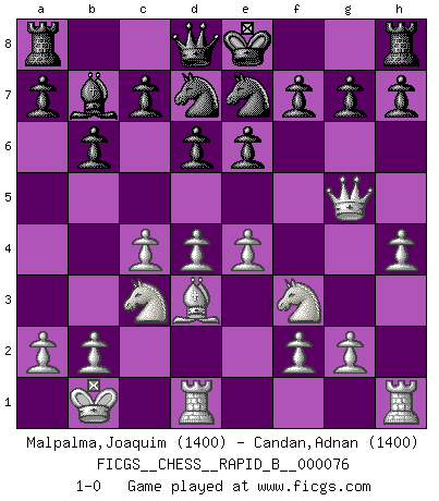 Last move : 1-0 2008 January 8 22:57:46 [Event "FICGS__CHESS__RAPID_B__000076"] [Site "FICGS"] [Date "2007.11.26"] [Round "1"] [White "Malpalma,Joaquim"] [Black "Candan,Adnan"] [Result "1-0"] [WhiteElo "1400"] [BlackElo "1400"] 1.d4 Nf6 2.c4 e6 3.Nf3 Bb4+ 4.Bd2 Bxd2+ 5.Qxd2 b6 6.Nc3 Bb7 7.e3 d6 8.Bd3 Nbd7 9.e4 Nf8 10.O-O-O Ng6 11.h4 Ne7 12.Kb1 Nd7 13.Qg5 1-0 This chess game has been lost on time (started : 2007.11.26 2:17:45) Bogo-Indian defense Queenside Castling by player White (move 10) Player White won this chess game. Follow this game move after move (download)I don't believe in psychology. I believe in good moves. (Bobby Fischer) Es liegt in der Natur, vernüftig zu denken und unlogisch zu handeln. (Anatole France) Un buen sacrificio es aquel que aunque no sea necesariamente sólido, deja a tu oponente aturdido y confuso. (Rudolph Spielmann) La tactique est l'élément le plus important du milieu de jeu. (Siegbert Tarrasch) To be champion requires more than simply being a strong player; one has to be a strong human being as well. (Anatoly Karpov)