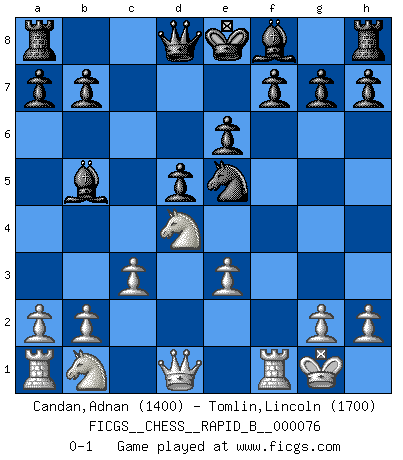 Last move : 0-1 2008 January 6 22:48:50 [Event "FICGS__CHESS__RAPID_B__000076"] [Site "FICGS"] [Date "2007.11.26"] [Round "1"] [White "Candan,Adnan"] [Black "Tomlin,Lincoln"] [Result "0-1"] [WhiteElo "1400"] [BlackElo "1700"] 1.e4 e6 2.d4 d5 3.e5 c5 4.c3 Nc6 5.Nf3 Nge7 6.Be3 Nf5 7.Bd3 cxd4 8.Nxd4 Nxe3 9.fxe3 Nxe5 10.Bb5+ Bd7 11.O-O Bxb5 0-1 This chess game has been lost on time (started : 2007.11.26 2:17:45) French : Advance, Paulsen attack Kingside Castling by player White (move 11) Player Black won this chess game. Follow this game move after move (download)If a ruler does not understand Chess, how can he rule over a kingdom ? (King Khusros II) Kleine Schachspieler machen Mist, und große Schachspieler machen Mist, aber große machen weniger Mist. (Fritz Sämisch) Sin errores no puede haber brillantez. (Emanuel Lasker) Ce qui est bien, c'est d'avoir tout un tas de pièces en prise : l'adversaire ne peut en prendre qu'une à la fois. Cité par Thierry Audin. If only faces could talk... (Pat Summerall, Sportscaster during the Super Bowl)