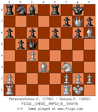 Last move : 1-0 2008 January 10 12:12:7 [Event "FICGS__CHESS__RAPID_B__000076"] [Site "FICGS"] [Date "2007.11.26"] [Round "1"] [White "Perevozchikov,Vjacheslav"] [Black "Dsouza,Stanislaus"] [Result "1-0"] [WhiteElo "1740"] [BlackElo "1600"] 1.Nf3 d5 2.c4 e6 3.d4 c6 4.e3 Nf6 5.Nc3 Bb4 6.Bd3 Bxc3+ 7.bxc3 dxc4 8.Bxc4 Ne4 9.Qc2 Nd6 10.Bd3 g6 11.e4 O-O 12.O-O Nb5 13.e5 a6 14.Bg5 Qa5 15.c4 Nxd4 16.Nxd4 Qxe5 17.Nf3 Qc5 18.Qc3 b5 19.Bh6 Re8 20.Qg7+ 1-0 Reti Opening Kingside Castling by player Black (move 11) Kingside Castling by player White (move 12) Player White won this chess game. Follow this game move after move (download)With or without the title, Bobby Fischer was unquestionably the greatest player of his time. (Burt Hochberg) Als ich elf wurde, wurde ich einfach gut. (Robert James Fischer) Fischer es una tragedia del Ajedrez Americano a la par con Morphy y Pillsbury. (Mig Greengard) Les échecs, c'est l'art d'analyser. (Mikhail Botvinnik) Every man's memory is his private literature. (Aldous Huxley)