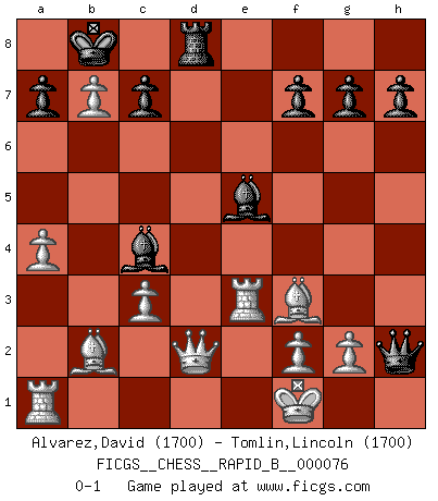 Last move : 0-1 2007 December 10 16:51:30 [Event "FICGS__CHESS__RAPID_B__000076"] [Site "FICGS"] [Date "2007.11.26"] [Round "1"] [White "Alvarez,David"] [Black "Tomlin,Lincoln"] [Result "0-1"] [WhiteElo "1700"] [BlackElo "1700"] 1.e4 e5 2.Nf3 Nf6 3.Nxe5 Nc6 4.Nxc6 dxc6 5.Nc3 Bc5 6.Be2 Qd4 7.O-O Nxe4 8.Nxe4 Qxe4 9.Bf3 Qh4 10.b3 Be6 11.Bb2 O-O-O 12.a4 Bd4 13.c3 Bf6 14.b4 Rd3 15.b5 Qf4 16.Re1 Rxd2 17.Qc1 Rhd8 18.bxc6 Bd5 19.cxb7+ Kb8 20.Re3 Be5 21.Qxd2 Qxh2+ 22.Kf1 Bc4+ 0-1 Petrov's defense Kingside Castling by player White (move 7) Queenside Castling by player Black (move 11) Player Black won this chess game. Follow this game move after move (download)Alekhine is a poet who creates a work of art out of something that would hardly inspire another man to send home a picture post card. (Max Euwe) Ich brauche nur einen Blick auf das Schachbrett zu werfen, und weiß schon, was in der Stellung steckt, was geschehen kann und was geschehen wird. Alle übrigen suchen und prüfen, ich aber weiß es! (José Raúl Capablanca) Mis oponentes también hacen buenas movidas. A veces yo no tomo esas cosas en consideración. (Bobby Fischer) Vous n'êtes pas toujours obligé de jouer le meilleur coup. Un coup doit être actif, entreprenant, correct et beau ! (David Bronstein) Wawaweewa ! (Borat: Cultural learnings of America for make benefit glorious nation of Kazakhstan)