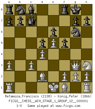 Last move : 1-0 2006 October 4 4:45:56 [Event "FICGS__CHESS__WCH_STAGE_1_GROUP_12__000001"] [Site "FICGS"] [Date "2006.07.01"] [Round "1"] [White "Retamoza,Francisco"] [Black "Konig,Peter"] [Result "1-0"] [WhiteElo "2138"] [BlackElo "1866"] 1.e4 e6 2.d4 d5 3.Nc3 Bb4 4.e5 c5 5.a3 Bxc3+ 6.bxc3 Qc7 7.Qg4 f5 8.Qg3 cxd4 9.cxd4 Ne7 10.c3 O-O 11.Nh3 Ng6 12.Bd2 1-0 French : Winawer, Classical variation Kingside Castling by player Black (move 10) Player White won this chess game. Follow this game move after move (download)I still hope to kill Fischer. (Boris Spassky) Die Arbeit ist etwas Unnatürliches. Die Faulheit allein ist göttlich. (Anatole France) El Ajedrez es en su esencia, un juego. En su forma, un arte. Y en su ejecución, una ciencia. (Baron Tassilo) Botvinnik disait en comparant les échecs à la musique: Il existe une science dont le but est l'étude de l'acoustique et des sons. Mais il y a aussi un art qui se sert de l'océan des sons : c'est la musique. De toute évidence, il en est de même pour la pensée. La logique est l'étude des lois de la réflexion et les échecs reflètent, en tant qu'art, le côté logique de la réflexion, sous la forme d'images artistiques... Extrait de Fischer - Spassky, Reykjavik 1972 par Alexander & F. Wyndham (Ed. Solar), p 37. Some people are so afraid to die that they never begin to live. (Henry Van Dyke)