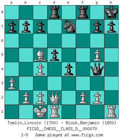 Last move : 1-0 2008 January 2 18:22:8 [Event "FICGS__CHESS__CLASS_D__000070"] [Site "FICGS"] [Date "2007.11.26"] [Round "1"] [White "Tomlin,Lincoln"] [Black "Block,Benjamin"] [Result "1-0"] [WhiteElo "1700"] [BlackElo "1800"] 1.e4 e5 2.Nf3 Nf6 3.Nxe5 d6 4.Nf3 Nxe4 5.Nc3 Nxc3 6.dxc3 Be7 7.Bc4 O-O 8.Be3 Be6 9.Bxe6 fxe6 10.Qd4 Qd7 11.O-O-O Nc6 12.Qg4 Rad8 13.c4 e5 14.Qe4 Qf5 15.Qd5+ Kh8 16.a3 Bf6 17.h4 Qg4 18.Ng5 Bxg5 19.hxg5 Ne7 20.Qd3 e4 21.Qd2 d5 22.Bc5 1-0 Petrov : Nimzovich attack Kingside Castling by player Black (move 7) Queenside Castling by player White (move 11) Player White won this chess game. Follow this game move after move (download)When you don't know what to play, wait for an idea to come into your opponent's mind. You may be sure that idea will be wrong. (Siegbert Tarrasch) Ohne Fehler kann es keine Brillanz geben. (Emanuel Lasker) Aunque la mayoría de la gente disfruta observar las partidas de los grandes Maestros de ataque, algunos de los jugadores mas notables en la historia han sido los jugadores silenciosos posicionales. Lentamente ellos te aplastan despojandote de tu espacio, congestionando tus piezas y dejandote virtualmente sin nada que hacer. (Yasser Seirawan) La vie et les Echecs sont tous les deux une lutte constante. (Lasker) There will be no order, only chaos. (Sol Robeson in Pi by Darren Aronofsky)