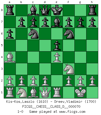 Last move : 1-0 2008 January 21 23:34:11 [Event "FICGS__CHESS__CLASS_D__000070"] [Site "FICGS"] [Date "2007.11.26"] [Round "1"] [White "Kis-Kos,Laszlo"] [Black "Dreev,Vladimir"] [Result "1-0"] [WhiteElo "1610"] [BlackElo "1700"] 1.e4 e5 2.Nf3 Nc6 3.Bb5 a6 4.Ba4 Nf6 5.O-O Be7 6.Re1 1-0 This chess game has been lost on time (started : 2007.11.26 18:15:48) Ruy Lopez : Closed defense Kingside Castling by player White (move 5) Player White won this chess game. Follow this game move after move (download)The tactician knows what to do when there is something to do; whereas the strategian knows what to do when there is nothing to do. (Gerald Abrahams) Wie gewinnt Tal? Er entwickelt alle seine Figuren in die Brettmitte und opfert sie dann irgendwo. (Robert James Fischer) No volvere nunca a jugar contigo. Has insultado a mi amigo. - cuando un oponente se maldijo por una mala jugada (Miguel Najdorf) Les Echecs ont trois composantes : le temps, l'espace et le matériel en dernier. (Mikhail Tal) There are two kinds of tragedy in this world, one is not getting what you want and the other is getting. (Lord of war)