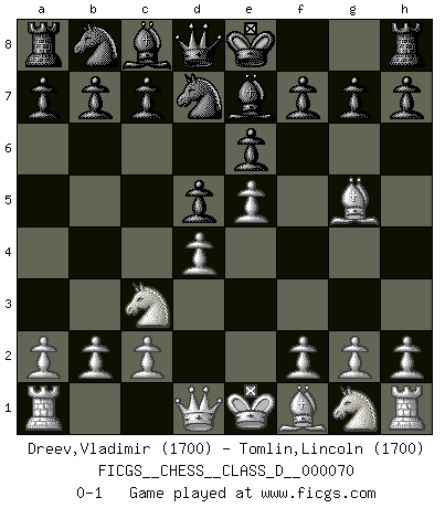 Last move : 0-1 2008 January 21 11:33:12 [Event "FICGS__CHESS__CLASS_D__000070"] [Site "FICGS"] [Date "2007.11.26"] [Round "1"] [White "Dreev,Vladimir"] [Black "Tomlin,Lincoln"] [Result "0-1"] [WhiteElo "1700"] [BlackElo "1700"] 1.e4 e6 2.d4 d5 3.Nc3 Nf6 4.Bg5 Be7 5.e5 Nfd7 0-1 This chess game has been lost on time (started : 2007.11.26 18:15:48) French : Classical Player Black won this chess game. Follow this game move after move (download)When in doubt... play Chess ! (Tevis) Schon mancher Spieler hat aufgegeben, um zu vermeiden, daß er eine Figur verliert. (Savielly Grigorievitsch Tartakower) El Ajedrez es como la guerra en un tablero. (Bobby Fischer) 'L'échange des dames est un coup dur pour les deux adversaires...' Un journaliste lors d'une partie du match Spassky-Fischer Now you put water in a cup, it becomes the cup; You put water into a bottle it becomes the bottle; You put it in a teapot it becomes the teapot. Water can flow or it can crash. Be water, my friend. (Bruce Lee)