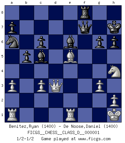 Last move : 1/2-1/2 2006 September 15 3:46:51 [Event "FICGS__CHESS__CLASS_D__000001"] [Site "FICGS"] [Date "2006.04.12"] [Round "1"] [White "Benitez,Ryan"] [Black "De Noose,Daniel"] [Result "1/2-1/2"] [WhiteElo "1400"] [BlackElo "1400"] 1.d4 Nf6 2.Nf3 e6 3.c4 b6 4.a3 Bb7 5.Nc3 Be7 6.d5 O-O 7.e4 d6 8.Be2 c6 9.dxe6 fxe6 10.Ng5 Qd7 11.O-O e5 12.f4 exf4 13.Bxf4 h6 14.Nf3 Nxe4 15.Nd4 Nxc3 16.bxc3 Na6 17.Bg4 Qe8 18.Nf5 d5 19.Re1 Bc5+ 20.Kh1 Qg6 21.Nh4 Qf6 22.Be6+ Kh7 23.Qc2+ g6 24.g3 Rad8 25.Bh3 Bc8 26.Bf1 dxc4 27.Bxc4 b5 28.Bd3 Rxd3 29.Qxd3 Be6 30.Be5 Qf7 1/2-1/2 Queen's pawn game Kingside Castling by player Black (move 6) Kingside Castling by player White (move 11) This chess game ended in a draw. Follow this game move after move (download)There is only one thing Fischer does in Chess without pleasure: to lose ! (Boris Spassky) Wenn Du nicht kämpfst, um anderen etwas zu beweisen, sondern nur für Dich selbst, dann bist du fast unbesiegbar. (Garry Kasparov) El pensamiento metódico es mas útil en el Ajedrez que la inspiración. (C. J. S. Purdy) Même un GMI sait rarement calculer sur plus de cinq coups une attaque à sacrifices. (Rudolf Spielmann) Fear is the path to the dark side. Fear leads to anger; anger leads to hate; hate leads to suffering. I sense much fear in you. (Master Yoda in Star Wars ep.1)