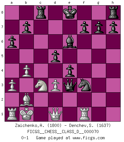 Last move : 0-1 2007 December 22 8:34:46 [Event "FICGS__CHESS__CLASS_D__000070"] [Site "FICGS"] [Date "2007.11.26"] [Round "1"] [White "Zaichenko,Andrey"] [Black "Denchev,Stanimir"] [Result "0-1"] [WhiteElo "1800"] [BlackElo "1637"] 1.b4 e5 2.Bb2 e4 3.e3 Nf6 4.a3 d5 5.c4 c6 6.cxd5 cxd5 7.Bb5+ Nbd7 8.Ne2 a6 9.Bxd7+ Bxd7 10.O-O Bd6 11.d3 Bxh2+ 12.Kxh2 Ng4+ 13.Kg1 Qh4 14.Re1 Qh2+ 15.Kf1 Qh1+ 16.Ng1 Nh2+ 17.Ke2 Bg4+ 18.Nf3 Qxg2 19.Kd2 Qxf2+ 20.Kc1 Rc8+ 21.Nc3 Nxf3 22.Rf1 Qxe3+ 23.Kb1 Be6 0-1 Polish (Sokolsky) opening Kingside Castling by player White (move 10) Player Black won this chess game. Follow this game move after move (download)What is the difference between chess and football? Everybody understands football, but nobody plays it. Everybody plays chess, but nobody understands it. Everything is relative. (Vladimir Kramnik) Weshalb minderdergeübte Spieler mit g2-g4 beginnen? Die betreffenden sind unschlüssig, ob sie nun rechts (h4) oder links (f4) beginnen sollen, und in ihrer Ratlosigkeit entschliessen sie sich nach guter Bürgerart dazu, den goldenen Mittelweg zu wählen. (Aaron Nimzowitsch) Tu cuerpo tiene que estar en óptima condición. Tu Ajedrez se deteriora como lo hace tu cuerpo. No puedes separar la mente y el cuerpo. (Bobby Fischer) Aucun coup ne doit être joué sans but. (Pedro Damiano) Somewhere in the world there is an epigram for every dilemma. (Hendrik Willem van Loon)