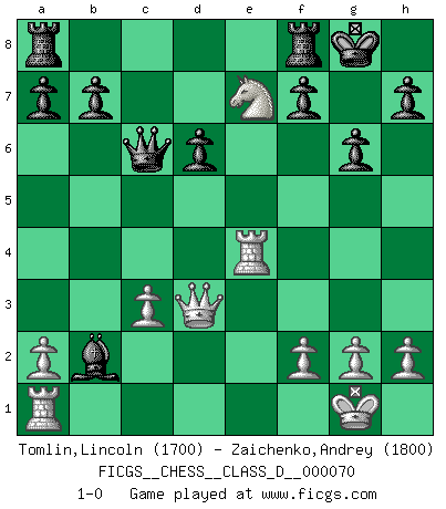 Last move : 1-0 2007 December 2 18:55:50 [Event "FICGS__CHESS__CLASS_D__000070"] [Site "FICGS"] [Date "2007.11.26"] [Round "1"] [White "Tomlin,Lincoln"] [Black "Zaichenko,Andrey"] [Result "1-0"] [WhiteElo "1700"] [BlackElo "1800"] 1.e4 c5 2.Nc3 Nc6 3.Nf3 d6 4.d4 cxd4 5.Nxd4 Nf6 6.Bg5 g6 7.Bxf6 exf6 8.Nd5 Bg7 9.Bb5 Bd7 10.O-O O-O 11.Re1 Nxd4 12.Bxd7 Qxd7 13.Qxd4 f5 14.Qd3 fxe4 15.Rxe4 Bxb2 16.c3 Qc6 17.Ne7+ 1-0 Sicilian : Closed, 2...Nc6 Kingside Castling by player White (move 10) Kingside Castling by player Black (move 10) Player White won this chess game. Follow this game move after move (download)Many Chess players were surprised when after the game, Fischer quietly explained: 'I had already analyzed this possibility' in a position which I thought was not possible to foresee from the opening. (Mikhail Tal) Die unerbitterlichsten Regeln im Schach sind die Ausnahmen. (Savielly Grigorievitsch Tartakower) Nada excita más a Grandes Maestros aburridos que una novedad teórica. (Dominic Lawson) Le jeu d'échecs est comme rejeté hors du temps. (Antoine de Saint-Exupéry) Life is pain my dear and anyone who says otherwise is selling something. (Princess Bride)