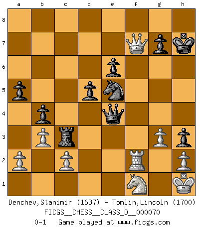 Last move : 0-1 2007 December 19 13:30:57 [Event "FICGS__CHESS__CLASS_D__000070"] [Site "FICGS"] [Date "2007.11.26"] [Round "1"] [White "Denchev,Stanimir"] [Black "Tomlin,Lincoln"] [Result "0-1"] [WhiteElo "1637"] [BlackElo "1700"] 1.b3 Nf6 2.Nf3 e6 3.Bb2 d5 4.e3 c5 5.Bb5+ Bd7 6.Nc3 Bd6 7.O-O Nc6 8.d4 cxd4 9.Nxd4 Nxd4 10.exd4 a6 11.Bd3 O-O 12.Re1 Re8 13.Qf3 Bc6 14.Ne2 Qc7 15.Ng3 Bb5 16.Rac1 Bxd3 17.Qxd3 Bf4 18.Rb1 Rec8 19.Re2 h5 20.Bc1 h4 21.Bxf4 Qxf4 22.Nf1 b5 23.Nd2 b4 24.Nf1 Ne4 25.Rbe1 Rc3 26.Qd1 Rac8 27.f3 Nd6 28.Rd2 a5 29.R1e2 Nf5 30.Rd3 Rxd3 31.Qxd3 Rc3 32.Qb5 Nxd4 33.Qe8+ Kh7 34.Rf2 h3 35.g3 Nxf3+ 36.Kh1 Qe4 37.Qxf7 Ne5 0-1 Nimzovich-Larsen attack : Indian variation Kingside Castling by player White (move 7) Kingside Castling by player Black (move 11) Player Black won this chess game. Follow this game move after move (download)When the Chess game is over, the Pawn and the King go back to the same box. (Irish saying) Sie bekommen vielleicht den Eindruck, dass die Spitzenspieler überhaupt gar nicht so stark sind. Aber das stimmt nicht. Es ist eine Illusion. Mit einem Computer an der Seite ist es sehr leicht, Urteile zu fällen, aber wenn man alleine am Brett sitzt, sieht die Sache ganz anders aus. (Vladimir Kramnik) El Ajedrez es despiadado: debes de estar preparado para matar gente. (Nigel Short) Les erreurs sont comme les malheurs, elles n'arrivent jamais seules. (Siegbert Tarrasch) Hello Thibault, if I have had a plan (and I had one, I hope), I have forgotten it during the last week... - Hello Heinz-Georg. What do you mean a plan ? (Anonymous players, during a Big Chess game)