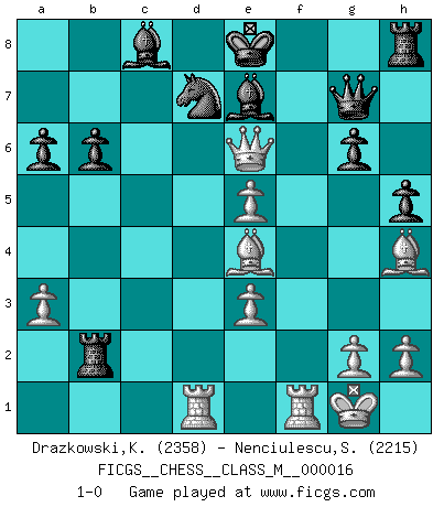 Last move : 1-0 2008 March 10 11:43:48 [Event "FICGS__CHESS__CLASS_M__000016"] [Site "FICGS"] [Date "2007.11.28"] [Round "1"] [White "Drazkowski,Krzysztof"] [Black "Nenciulescu,Silviu"] [Result "1-0"] [WhiteElo "2358"] [BlackElo "2215"] 1.d4 Nf6 2.c4 e6 3.Nf3 b6 4.a3 Bb7 5.Nc3 d5 6.cxd5 Nxd5 7.Qc2 Nxc3 8.Qxc3 Nd7 9.Bg5 f6 10.Bf4 c5 11.Rd1 Rc8 12.Bg3 a6 13.e3 cxd4 14.Qxd4 e5 15.Qg4 Qe7 16.Be2 g6 17.O-O Rc2 18.Bd3 Rxb2 19.Nxe5 fxe5 20.Bh4 Qf7 21.Be4 Bc8 22.f4 h5 23.Qh3 Be7 24.fxe5 Qg7 25.Qe6 1-0 Queen's Indian : Petrosian system Kingside Castling by player White (move 17) Player White won this chess game. Follow this game move after move (download)The battle for the ultimate truth will never be won. And that's why Chess is so fascinating. (Hans Kmoch) Ich verstehe mehr vom Schach als irgendein anderer lebender Meister. (José Raúl Capablanca) En manos de Fischer's, una diminuta ventaja teórica es tan buena como tener una Reina de ventaja. (Isaac Kashdan) Dans le domaine de la peinture, de la gravure et de la sculpture, dès la première décennie de notre siècle, les artistes abandonnent la représentation de la partie d'échecs pour se concentrer sur les pièces, sur les échiquiers et sur toutes les variations auxquelles les unes et les autres peuvent donner lieu. On passe en quelque sorte d'un thème social à un thème musical (au sens de la musica médiévale, c'est-à-dire d'une notion qui inclue le rythme, l'harmonie, la construction et la déconstruction, etc.). Graphiquement et picturalement, l'échiquier apparaît comme une structure ouverte, dynamique, d'une richesse infinie, autorisant toutes les combinatoires et débouchant sur des mouvements et des rythmes de nature exponentielle. (Michel Pastoureau) If I had no sense of humor, I would long ago have committed suicide. (Mahatma Gandhi)