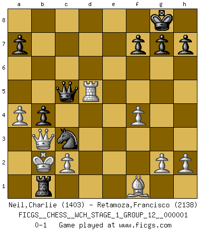 Last move : 0-1 2006 September 17 11:45:18 [Event "FICGS__CHESS__WCH_STAGE_1_GROUP_12__000001"] [Site "FICGS"] [Date "2006.07.01"] [Round "1"] [White "Neil,Charlie"] [Black "Retamoza,Francisco"] [Result "0-1"] [WhiteElo "1403"] [BlackElo "2138"] 1.e4 c5 2.Nf3 Nc6 3.d4 cxd4 4.Nxd4 Nf6 5.Nc3 e6 6.Be3 Bb4 7.Nxc6 bxc6 8.Qd3 d5 9.O-O-O O-O 10.exd5 exd5 11.Na4 Qa5 12.b3 c5 13.Bd2 Bd7 14.Bxb4 cxb4 15.Be2 Bxa4 16.bxa4 Rac8 17.Qb3 Rc3 18.Qb1 Ne4 19.Rhf1 Ra3 20.Bd3 Nc3 21.Qb2 Rxa2 22.Qb3 Qc5 23.Rd2 Re8 24.f4 Ra1+ 25.Kb2 Rxf1 26.Bxf1 Re1 27.Rxd5 Rb1+ 0-1 Sicilian defense Queenside Castling by player White (move 9) Kingside Castling by player Black (move 9) Player Black won this chess game. Follow this game move after move (download)Chess is war over the board. The object is to crush the opponents mind. (Bobby Fischer) Ohne Leiden bildet sich kein Charakter. (Ernst Freiherr von Feuchtersleben) Nunca antes ha habido un jugador de Ajedrez con tal conocimiento a fondo de las complejidades del juego y una inmensa voluntad absolutamente indomable de ganar. Yo pienso que Fischer es el jugador mas grande que jamás haya existido. (Lisa Lane) On a dit que l'homme se distingue de l'animal par le fait qu'il achète plus de livres qu'il ne peut en lire. Je voudrais suggérer qu'inclure à la liste des livres quelques livres d'échecs rendrait la distinction manifeste. (Edward Lasker) Children in the dark cause accidents, accidents in the dark cause children. (Unknown)