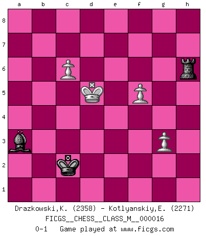 Last move : 0-1 2008 July 14 17:18:36 [Event "FICGS__CHESS__CLASS_M__000016"] [Site "FICGS"] [Date "2007.11.28"] [Round "1"] [White "Drazkowski,Krzysztof"] [Black "Kotlyanskiy,Edward"] [Result "0-1"] [WhiteElo "2358"] [BlackElo "2271"] 1.d4 d5 2.Nf3 Nf6 3.c4 c6 4.Nc3 e6 5.Bg5 dxc4 6.e4 b5 7.e5 h6 8.Bh4 g5 9.Nxg5 hxg5 10.Bxg5 Nbd7 11.g3 Bb7 12.Bg2 Qb6 13.exf6 c5 14.d5 O-O-O 15.O-O b4 16.Na4 Qb5 17.a3 Ne5 18.axb4 cxb4 19.Qd4 Nc6 20.dxc6 Rxd4 21.cxb7+ Kb8 22.Be3 e5 23.b3 c3 24.Rfd1 Bh6 25.Bxd4 exd4 26.Rxd4 c2 27.Rc4 Qxc4 28.bxc4 Rd8 29.Bf3 c1Q+ 30.Rxc1 Bxc1 31.Bd5 b3 32.Bxf7 b2 33.Bg6 Kxb7 34.h4 Rf8 35.f7 Ka6 36.Nc3 Ka5 37.Nb1 Kb4 38.f4 a5 39.h5 a4 40.Kf2 a3 41.Nxa3 Kxa3 42.h6 Ka2 43.Kf3 b1Q 44.Bxb1+ Kxb1 45.c5 Rxf7 46.Ke4 Rh7 47.Kd5 Rxh6 48.f5 Kc2 49.c6 Ba3 0-1 Queen's pawn game Queenside Castling by player Black (move 14) Kingside Castling by player White (move 15) Promotion Queen by player Black (move 29) Promotion Queen by player Black (move 43) 10 pieces endgame at move 44 : White KBPPPPP , Black KRB WHITE : King + 1 Bishop 5 Pawns BLACK : King + 1 Rook 1 Bishop 9 pieces endgame at move 44 : White KPPPPP , Black KRB WHITE : King + 5 Pawns BLACK : King + 1 Rook 1 Bishop 8 pieces endgame at move 45 : White KPPPP , Black KRB WHITE : King + 4 Pawns BLACK : King + 1 Rook 1 Bishop 7 pieces endgame at move 47 : White KPPP , Black KRB WHITE : King + 3 Pawns BLACK : King + 1 Rook 1 Bishop Player Black won this chess game. Follow this game move after move (download)Fischer sacrificed virtually everything most of us weakies (to use his term) value, respect, and cherish, for the sake of an artful, often beautiful board game, for the ambivalent privilege of being its greatest master. (Paul Kollar) Es ist im Leben wie im Schachspiel. Wir entwerfen einen Plan, dieser bleibt jedoch bedingt durch das, was im Schachspiel dem Gegner, im Leben dem Schicksal zu tun belieben wird. (Arthur Schopenhauer) Tu sabes, camarada Pachman, no disfruto el ser un Ministro, preferería jugar al Ajedrez como tu. (Che Guevara) La vie est comme un jeu d'échecs : nous esquissons un plan, mais celui-ci est tributaire de ce que daignent faire l'adversaire aux échecs et le destin dans la vie. (Arthur Schopenhauer) All battles are fought by scared men who'd rather be someplace else. (John Wayne in the movie In harm's way)