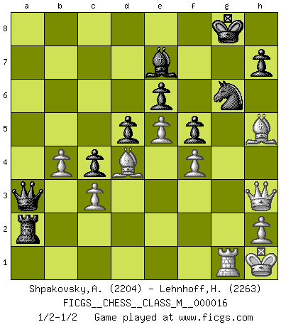 Last move : 1/2-1/2 2008 June 6 21:22:6 [Event "FICGS__CHESS__CLASS_M__000016"] [Site "FICGS"] [Date "2007.11.28"] [Round "1"] [White "Shpakovsky,Alexander"] [Black "Lehnhoff,Heinz-Georg"] [Result "1/2-1/2"] [WhiteElo "2204"] [BlackElo "2263"] 1.e4 c5 2.Nf3 e6 3.d4 cxd4 4.Nxd4 Nc6 5.Nc3 Qc7 6.Be2 a6 7.O-O Nf6 8.Be3 Bb4 9.Na4 Be7 10.Nxc6 bxc6 11.Nb6 Rb8 12.Nxc8 Qxc8 13.Bd4 c5 14.Be5 Rb6 15.Qd3 d6 16.Bc3 O-O 17.b3 d5 18.e5 Nd7 19.Qg3 Rc6 20.Rab1 c4 21.b4 Qb7 22.a3 Qb5 23.Bd4 a5 24.c3 axb4 25.axb4 Ra6 26.Ra1 Rfa8 27.Rxa6 Rxa6 28.f4 f5 29.Qh3 Nf8 30.g4 g6 31.Bf3 Ra2 32.Kh1 Qa4 33.gxf5 gxf5 34.Rg1+ Ng6 35.Bd1 Qa3 36.Bh5 1/2-1/2 Sicilian : Taimanov (Bastrikov) variation Kingside Castling by player White (move 7) Kingside Castling by player Black (move 16) This chess game ended in a draw. Follow this game move after move (download)Chess is mental torture. (Garry Kasparov) Pläne sind die Träume des Verständigen. (Ernst Freiherr von Feuchtersleben) Realmente no sabemos como el juego fue inventado, aunque hay sospechas. Tan pronto como descubramos a los culpables, se los haremos saber. (Bruce Pandolfini) Des points faibles ou des trous dans la position de l'adversaire doivent être occupés par des pièces et non pas par des pions. (Siegbert Tarrasch) Every man's memory is his private literature. (Aldous Huxley)