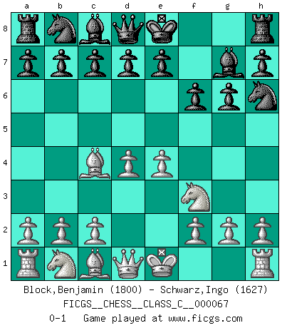Last move : 0-1 2008 January 2 18:20:49 [Event "FICGS__CHESS__CLASS_C__000067"] [Site "FICGS"] [Date "2007.11.29"] [Round "1"] [White "Block,Benjamin"] [Black "Schwarz,Ingo"] [Result "0-1"] [WhiteElo "1800"] [BlackElo "1627"] 1.e4 g6 2.d4 Bg7 3.Nf3 f6 4.Bc4 Nh6 0-1 Robatsch (Modern) defense Player Black won this chess game. Follow this game move after move (download)Life is a kind of Chess, with struggle, competition, good and ill events. (Benjamin Franklin) Schachspieler können ausgezeichnet Varianten am Schachbrett berechnen, aber nicht im realen Leben. Zu stark ist der Individualismus im Schach ausgeprägt, und für viele ist ein kleiner momentaner persönlicher Vorteil wichtiger als ein weit größerer Vorteil von morgen. (Anatoly Karpov) Antes de los Finales, los dioses han colocado el Juego Medio. (Siegbert Tarrasch) Donnez-moi un Cavalier en 6e et je gagnerais toutes mes parties. (Steinitz) Any activity becomes creative when the doer cares about doing it right or doing it better. (John Updike)