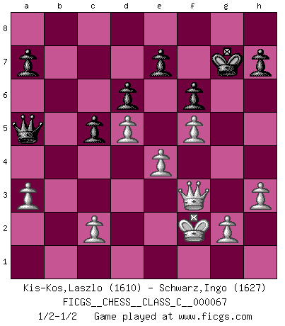 Last move : 1/2-1/2 2008 July 16 5:10:47 [Event "FICGS__CHESS__CLASS_C__000067"] [Site "FICGS"] [Date "2007.11.29"] [Round "1"] [White "Kis-Kos,Laszlo"] [Black "Schwarz,Ingo"] [Result "1/2-1/2"] [WhiteElo "1610"] [BlackElo "1627"] 1.e4 g6 2.d4 Bg7 3.Nc3 f6 4.f4 Nh6 5.Nf3 Nf7 6.Bc4 Nc6 7.O-O O-O 8.Be3 d6 9.d5 Na5 10.Bd3 c5 11.f5 g5 12.a3 b6 13.b4 Nb7 14.Ba6 Qd7 15.Rb1 Nbd8 16.Bc4 g4 17.Nd2 Ne5 18.Be2 Ndf7 19.Bxg4 Nxg4 20.Qxg4 Ne5 21.Qg3 Kh8 22.bxc5 bxc5 23.Rfe1 Rg8 24.Rb3 Ba6 25.Reb1 Qc7 26.Nb5 Bxb5 27.Rxb5 Bh6 28.Qe1 Bxe3+ 29.Qxe3 Rab8 30.Rxb8 Rxb8 31.Rxb8+ Qxb8 32.Qb3 Qc7 33.Kf2 Qa5 34.Nf3 Kg7 35.h3 Nxf3 36.Qxf3 1/2-1/2 Robatsch defense Kingside Castling by player White (move 7) Kingside Castling by player Black (move 7) This chess game ended in a draw. Follow this game move after move (download)Why must I lose to this idiot ? (Aron Nimzovich) Man wirke der falschen Auffassung entgegen, als ob jeder Zug Unmittelbares zu leisten habe; auch Werte- und Ruhezüge haben ihre Existenzberechtigung. (Aaron Nimzowitsch) Del Ajedrez se ha dicho que la vida no es lo suficientemente larga para él, pero eso es culpa de la vida, no del Ajedrez. (William Ewart Napier) Un footballeur joue avec ses pieds, parfois avec sa tête. Un joueur d'échecs ne joue qu'avec sa tête. Et quand il ne joue plus, il meurt. (Jacob Murray) Faith : not wanting to know what is true. (Friedrich Nietzsche)