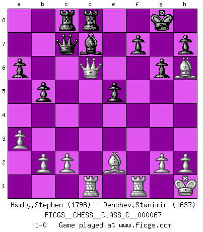 Last move : 1-0 2008 February 8 9:57:17 [Event "FICGS__CHESS__CLASS_C__000067"] [Site "FICGS"] [Date "2007.11.29"] [Round "1"] [White "Hamby,Stephen"] [Black "Denchev,Stanimir"] [Result "1-0"] [WhiteElo "1798"] [BlackElo "1637"] 1.e4 c5 2.Nf3 e6 3.d4 cxd4 4.Nxd4 a6 5.Nc3 Qc7 6.Be2 Nf6 7.O-O Nc6 8.Be3 Be7 9.f4 d6 10.Qe1 Bd7 11.Qg3 O-O 12.Kh1 b5 13.a3 e5 14.fxe5 dxe5 15.Rad1 Rac8 16.Nd5 Nxd5 17.Bh6 g6 18.Nxc6 Bxc6 19.exd5 Bd7 20.d6 Bxd6 21.Qd3 Rfd8 22.Qxd6 1-0 Sicilian : Kan, 5.Nc3 Kingside Castling by player White (move 7) Kingside Castling by player Black (move 11) Player White won this chess game. Follow this game move after move (download)I believe that Chess possesses a magic that is also a help in advanced age. A rheumatic knee is forgotten during a game of Chess and other events can seem quite unimportant in comparison with a catastrophe on the chessboard. (Vlastimil Hort) Kostenjuk hat keinen Sexappeal. (Loek van Wely) El Ajedrez es realmente noventa y nueve por ciento calculación. (Soltis) 'L'échange des dames est un coup dur pour les deux adversaires...' Un journaliste lors d'une partie du match Spassky-Fischer Whatever you do, don't be bored. This is absolutely the most exciting time we could have possibly hoped to be alive. And things are just starting. (From movie Waking life)
