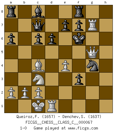 Last move : 1-0 2008 March 11 12:57:47 [Event "FICGS__CHESS__CLASS_C__000067"] [Site "FICGS"] [Date "2007.11.29"] [Round "1"] [White "Queiroz,Florencio"] [Black "Denchev,Stanimir"] [Result "1-0"] [WhiteElo "1657"] [BlackElo "1637"] 1.e4 c5 2.Nf3 d6 3.d4 cxd4 4.Nxd4 Nf6 5.Nc3 g6 6.Be3 Bg7 7.f3 O-O 8.Bc4 Nc6 9.Qd2 a6 10.Nxc6 bxc6 11.O-O-O Qc7 12.h4 h5 13.Bh6 Kh7 14.Bxg7 Kxg7 15.g4 hxg4 16.h5 gxf3 17.hxg6 Ng4 18.Rh7+ Kxg6 19.Rg7+ Kf6 20.Qg5+ 1-0 Sicilian : Dragon, Yugoslav attack, 7...O-O Kingside Castling by player Black (move 7) Queenside Castling by player White (move 11) Player White won this chess game. Follow this game move after move (download)What would Chess be without silly mistakes ? (Kurt Richter) Modernes Schach erfordert enorme Anspannung. Es ist für einen normalen Menschen unmöglich das auszuhalten. (Viktor Kortschnoi) Con el tiempo, empecé a progresar en partidas decisivas. Tal vez porque me di cuenta de una simple verdad: no solo estaba yo nervioso sino también mi oponente. (Mikhail Tal) Je crois qu'il existe des manières très spécifiques de jouer efficacement contre une machine. Evidemment, nous n'avons aucune chance en technique pure, parce que l'ordinateur calcule de manière parfaite. Mais lorsque nous faisons appel à notre cerveau, en utilisant l'intuition et la compréhension, alors nous restons beaucoup plus forts. (Anatoli Karpov) A good teacher is like a candle - it consumes itself to light the way for others. (Author unknown)