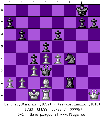 Last move : 0-1 2008 March 19 14:46:18 [Event "FICGS__CHESS__CLASS_C__000067"] [Site "FICGS"] [Date "2007.11.29"] [Round "1"] [White "Denchev,Stanimir"] [Black "Kis-Kos,Laszlo"] [Result "0-1"] [WhiteElo "1637"] [BlackElo "1610"] 1.d4 Nf6 2.f4 d5 3.e3 Bf5 4.Be2 e6 5.Nf3 Nc6 6.O-O Bd6 7.c3 O-O 8.Nbd2 Ne7 9.Ne5 Bxe5 10.fxe5 Nd7 11.Bf3 Bd3 12.Rf2 f6 13.exf6 Nxf6 14.Nb3 Bf5 15.Nc5 b6 16.Nd3 Qd6 17.Qe2 Ng6 18.g4 Bxd3 19.Qxd3 Nxg4 20.Bxg4 Rxf2 21.Kxf2 Qxh2+ 22.Ke1 Qg1+ 23.Kd2 Qxg4 24.Kc2 c5 25.Bd2 c4 26.Qf1 Rf8 27.Qh1 Rf2 28.e4 Qe2 29.Rd1 Qd3+ 30.Kc1 Nf4 0-1 Canard Opening Kingside Castling by player White (move 6) Kingside Castling by player Black (move 7) Player Black won this chess game. Follow this game move after move (download)Even the laziest King flees wildly in the face of a double check ! (Aaron Nimzowitsch) Was ist der Unterschied zwischen einem Strassenarbeiter und einem Schachspieler? --Der Schachspieler bewegt sich ab und zu. (Anonymous) Uno no tiene que jugar muy bien, es suficiente jugar mejor que el oponente. (Siegbert Tarrasch) Ce n'est pas pour s'amuser qu'il joue aux échecs : il célèbre un culte. (Vladimir Nabokov) I believe in luck. How else can you explain the success of those you dislike ? (Jean Cocteau)