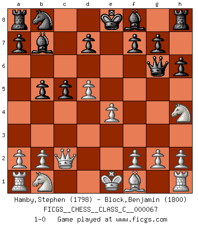Last move : 1-0 2008 January 2 18:21:37 [Event "FICGS__CHESS__CLASS_C__000067"] [Site "FICGS"] [Date "2007.11.29"] [Round "1"] [White "Hamby,Stephen"] [Black "Block,Benjamin"] [Result "1-0"] [WhiteElo "1798"] [BlackElo "1800"] 1.d4 Nf6 2.c4 e6 3.Nf3 c5 4.d5 exd5 5.cxd5 b5 6.Bg5 h6 7.Bxf6 Qxf6 8.Qc2 Bb7 9.e4 Qg6 10.Nh4 1-0 Queen's pawn game Player White won this chess game. Follow this game move after move (download)Not all artists are Chess players, but all Chess players are artists. (Marcel Duchamp) Lisa Lane, amerikanische Schachmeisterin, hatte Fischer einmal als stärksten lebenden Spieler bezeichnet. Antwort: Das ist richtig, aber Lisa Lane ist eigentlich nicht in der Lage, das zu beurteilen. (Robert James Fischer) Ciertamente, de todas la drogas del mundo, el Ajedrez debe ser el mas placentero permamentemente. (Assiac) Aidez vos pièces, elles vous aideront. (Paul Morphy) It's not a bug - it's an undocumented feature. (Anonymous)