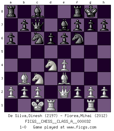 Last move : 1-0 2008 May 17 22:9:27 [Event "FICGS__CHESS__CLASS_A__000032"] [Site "FICGS"] [Date "2007.11.30"] [Round "1"] [White "De Silva,Dinesh"] [Black "Florea,Mihai"] [Result "1-0"] [WhiteElo "2197"] [BlackElo "2012"] 1.e4 c5 2.Nf3 Nc6 3.Nc3 d6 4.d4 cxd4 5.Nxd4 e6 6.Be3 Nf6 7.Bc4 Be7 8.Qe2 a6 9.O-O-O O-O 10.Bb3 Qc7 11.Rhg1 1-0 Sicilian defense Queenside Castling by player White (move 9) Kingside Castling by player Black (move 9) Player White won this chess game. Follow this game move after move (download)A chess genius has died; a loss for humanity. (Viktor Kortchnoi, about Bobby Fischer's death) Ich moechte nie einem Club beitreten, der Leute wie mich als Mitglieder aufnimmt. (Woody Allen) El Ajedrez es 99 por ciento táctica. (Teichmann) Karpov est une pièce de musée. (Garry Kasparov) You can only get smarter by playing a smarter opponent. (Revolver, movie)