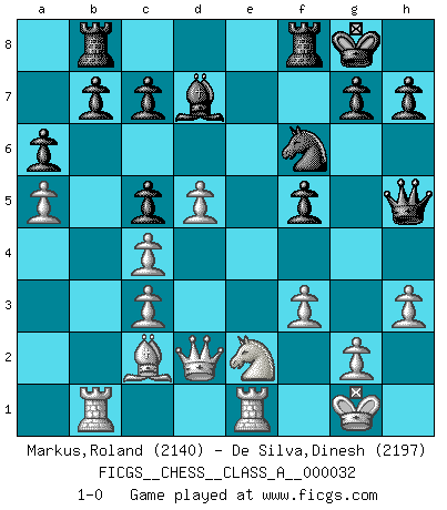 Last move : 1-0 2008 May 21 10:22:50 [Event "FICGS__CHESS__CLASS_A__000032"] [Site "FICGS"] [Date "2007.11.30"] [Round "1"] [White "Markus,Roland"] [Black "De Silva,Dinesh"] [Result "1-0"] [WhiteElo "2140"] [BlackElo "2197"] 1.e4 Nf6 2.e5 Nd5 3.d4 d6 4.c4 Nb6 5.exd6 exd6 6.Nc3 Be7 7.h3 O-O 8.Nf3 Bf6 9.Be2 Be6 10.d5 Bxc3+ 11.bxc3 Bd7 12.Bg5 f6 13.Be3 Na6 14.O-O Nc5 15.Re1 Re8 16.Nd4 f5 17.Nb3 Ne4 18.Qc2 Na4 19.Bd3 Qh4 20.f3 Nf6 21.Qd2 Qh5 22.Nd4 Nc5 23.Bc2 Rf8 24.a4 a6 25.Ne2 Rae8 26.Bxc5 dxc5 27.Rab1 Rb8 28.a5 1-0 This chess game has been lost on time (started : 2007.11.30 8:25:0) Alekhine's defense : Exchange variation Kingside Castling by player Black (move 7) Kingside Castling by player White (move 14) Player White won this chess game. Follow this game move after move (download)There is no remorse like the remorse of Chess. (H. G. Wells) Ich kämpfe solange mein Gegner einen Fehler machen kann. (Emanuel Lasker) El Ajedrez es realmente noventa y nueve por ciento calculación. (Soltis) Assurément je connaissais par expérience le mystérieux attrait de ce jeu royal, le seul entre tous les jeux inventés par les hommes qui échappe souverainement à la tyrannie du hasard, le seul où l'on ne doive sa victoire qu'à son intelligence ou plutôt à une certaine forme d'intelligence. Mais n'est-ce pas déjà le limiter injurieusement que d'appeler les échecs un jeu ? N'est-ce pas une science, un art ou quelque chose qui, comme le cercueil de Mahomet entre ciel et terre, est suspendu entre l'un et l'autre, et qui réunit un nombre incroyable de contraires ? [...] C'est une pensée qui ne mène à rien, une mathématique qui n'établit rien, un art qui ne laisse pas d'uvre, une architecture sans matière; et il l'a prouvé néanmoins qu'il était plus durable, à sa manière, que les livres ou que tout autre monument, ce jeu unique qui appartient à tous les peuples et à tous les temps, et dont personne ne sait quel dieu en fit don à la terre pour tuer l'ennui, pour aiguiser l'esprit et stimuler l'âme. Où commence-t-il, où finit-il ? (Stefan Zweig) I find your interest interesting. (Gregory House, House M.D.)